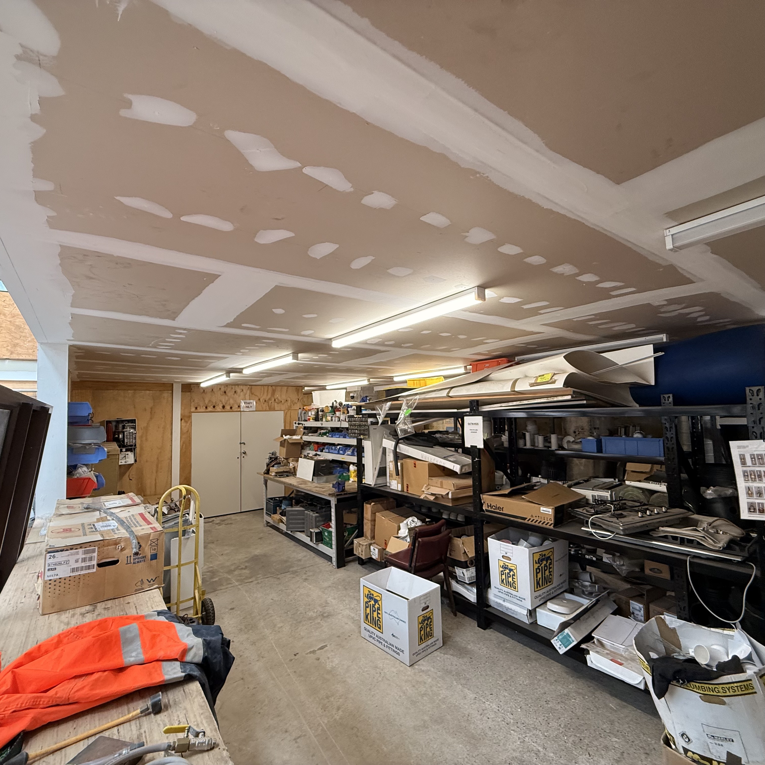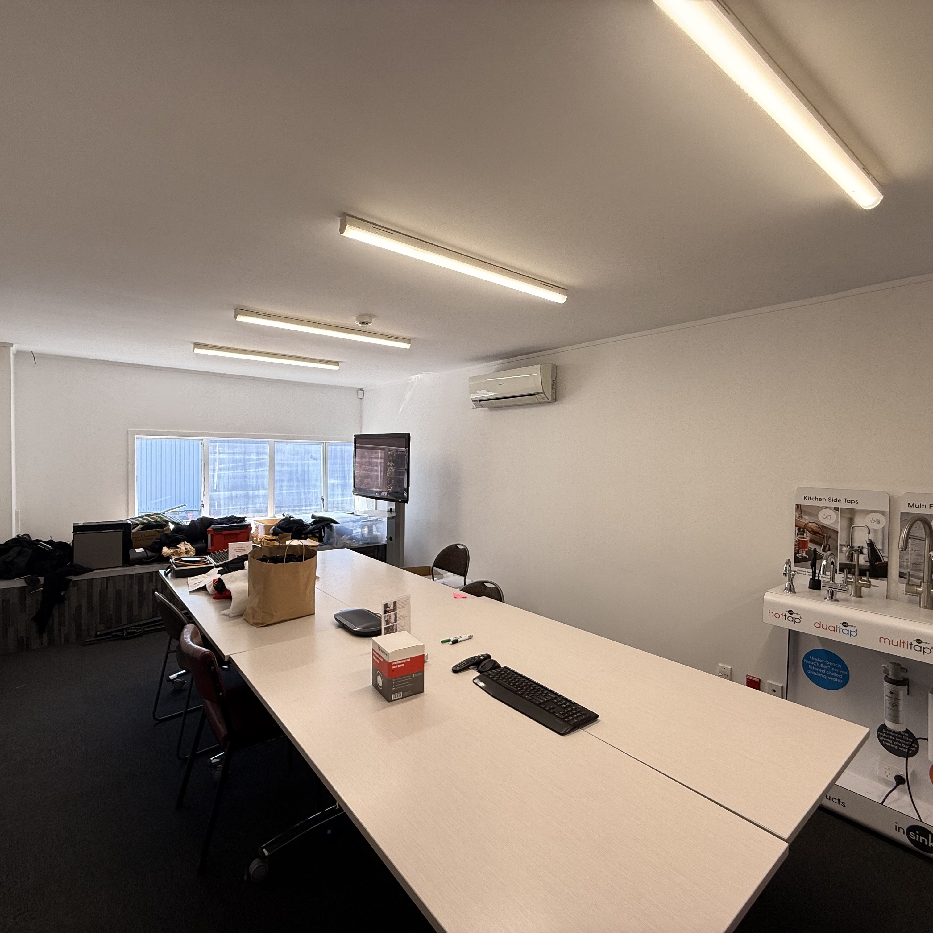 The unit features roller-door access leading into a low-stud workshop area at the front, with a secure storage space positioned at the rear. The premises also include a dedicated office area and access to shared kitchen and bathroom facilities.