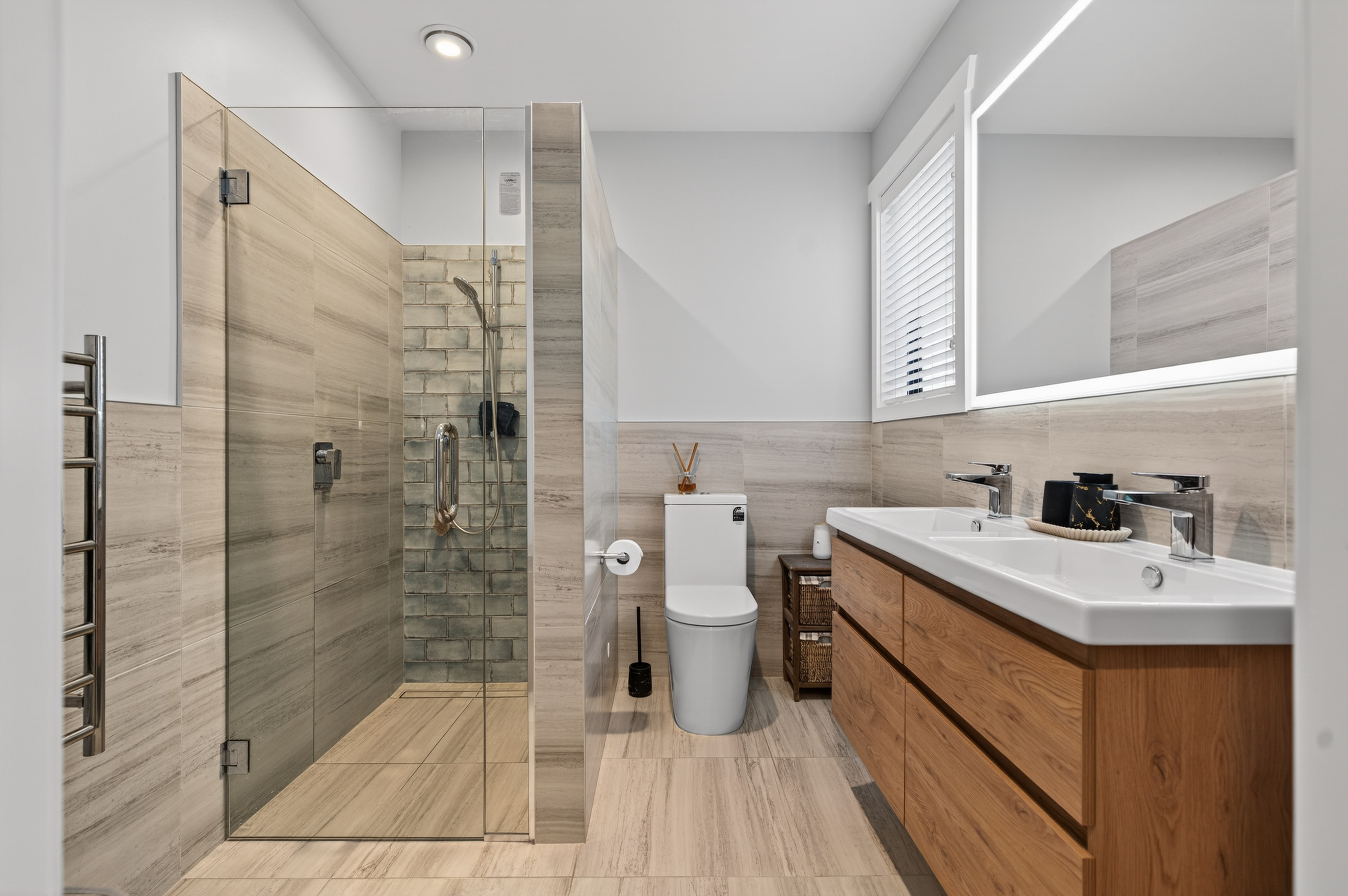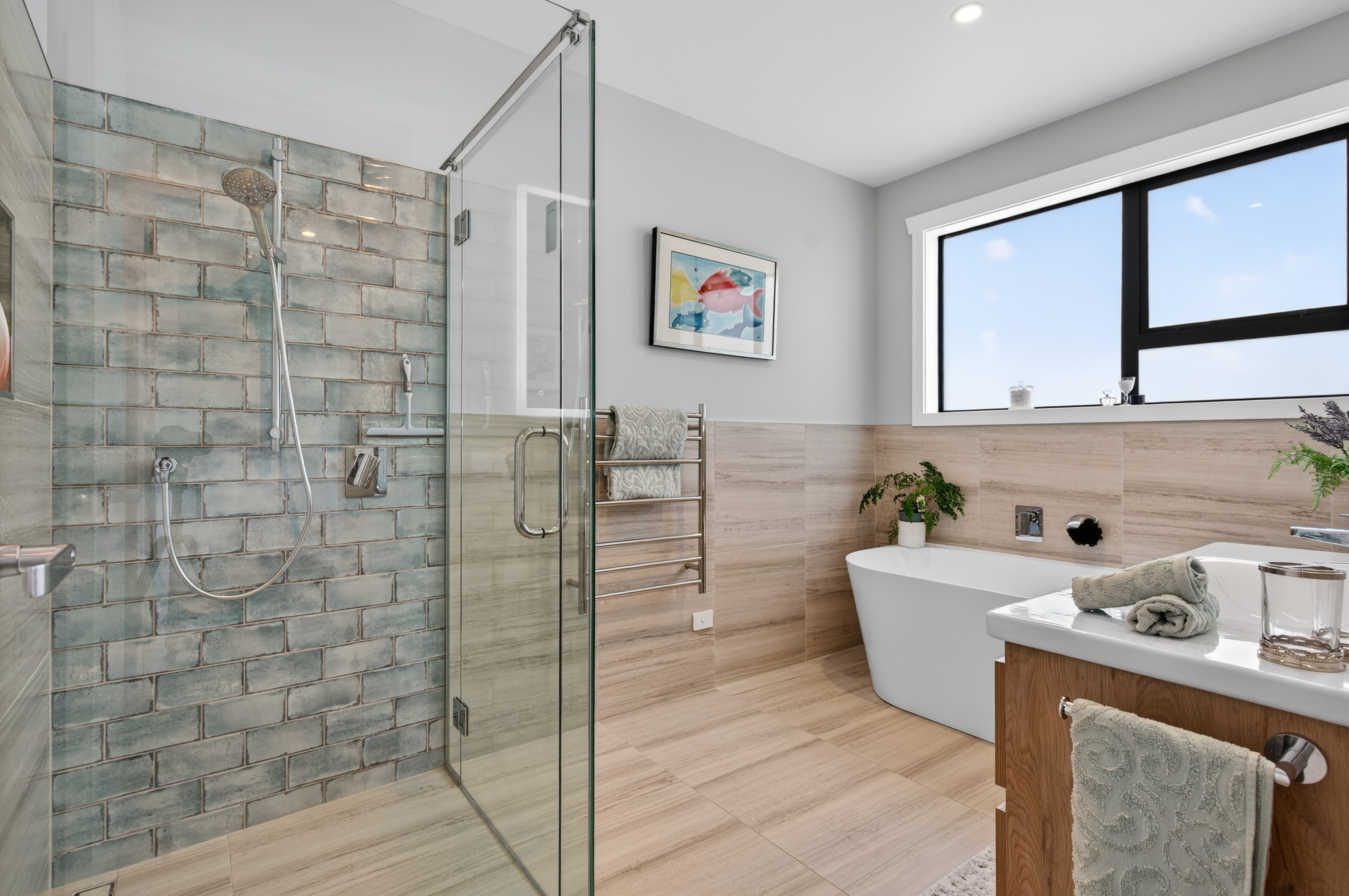 The home features three bedrooms. The master suite is generously sized, with access to the sunny front deck, a walk-through wardrobe, and modern ensuite with a double vanity and thoughtful finishes. The two additional double bedrooms are spacious and enjoy garden views. The family bathroom is inviting, modern and functional being complete with a freestanding bath and separate shower with stylish tiling.