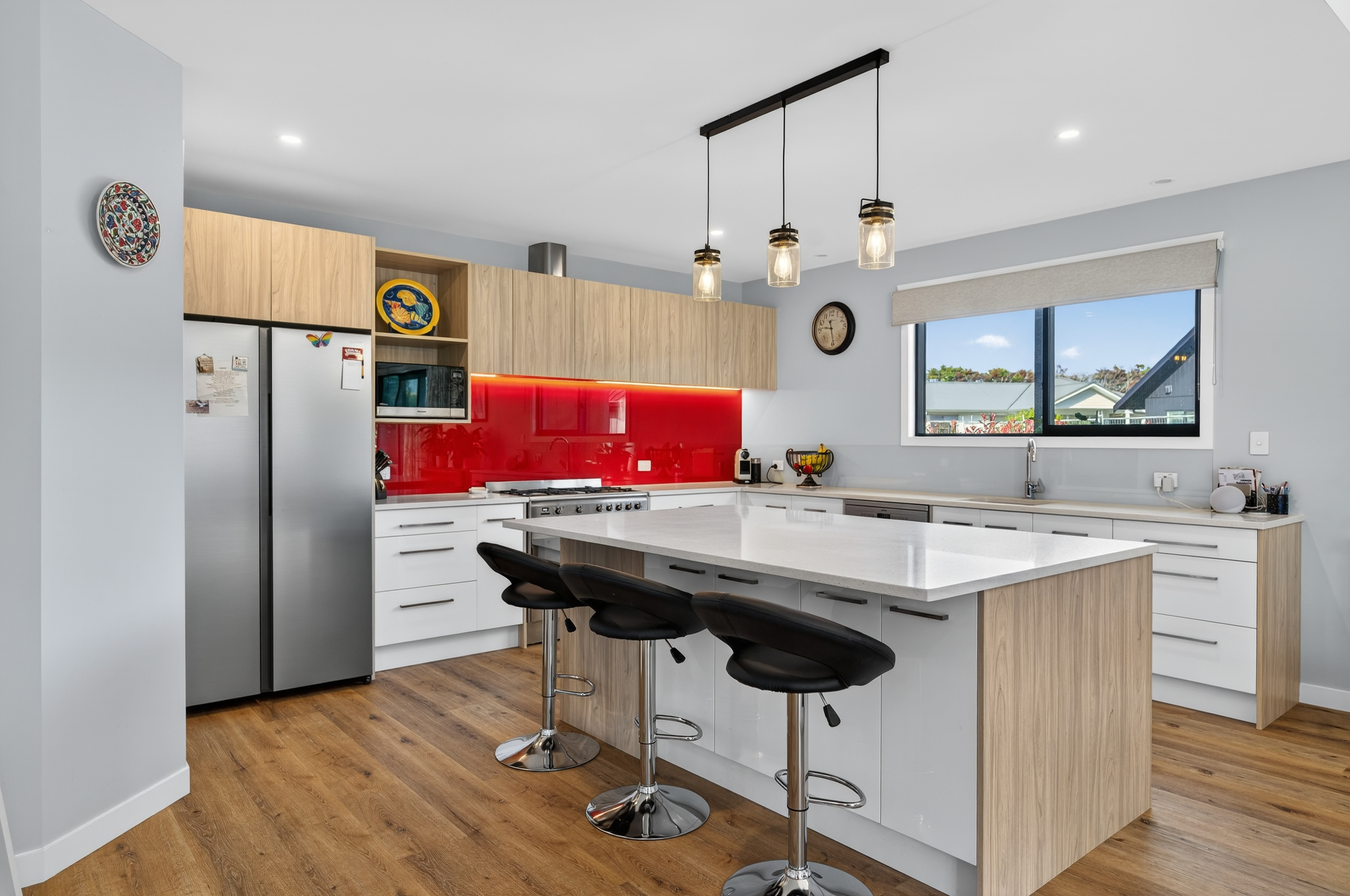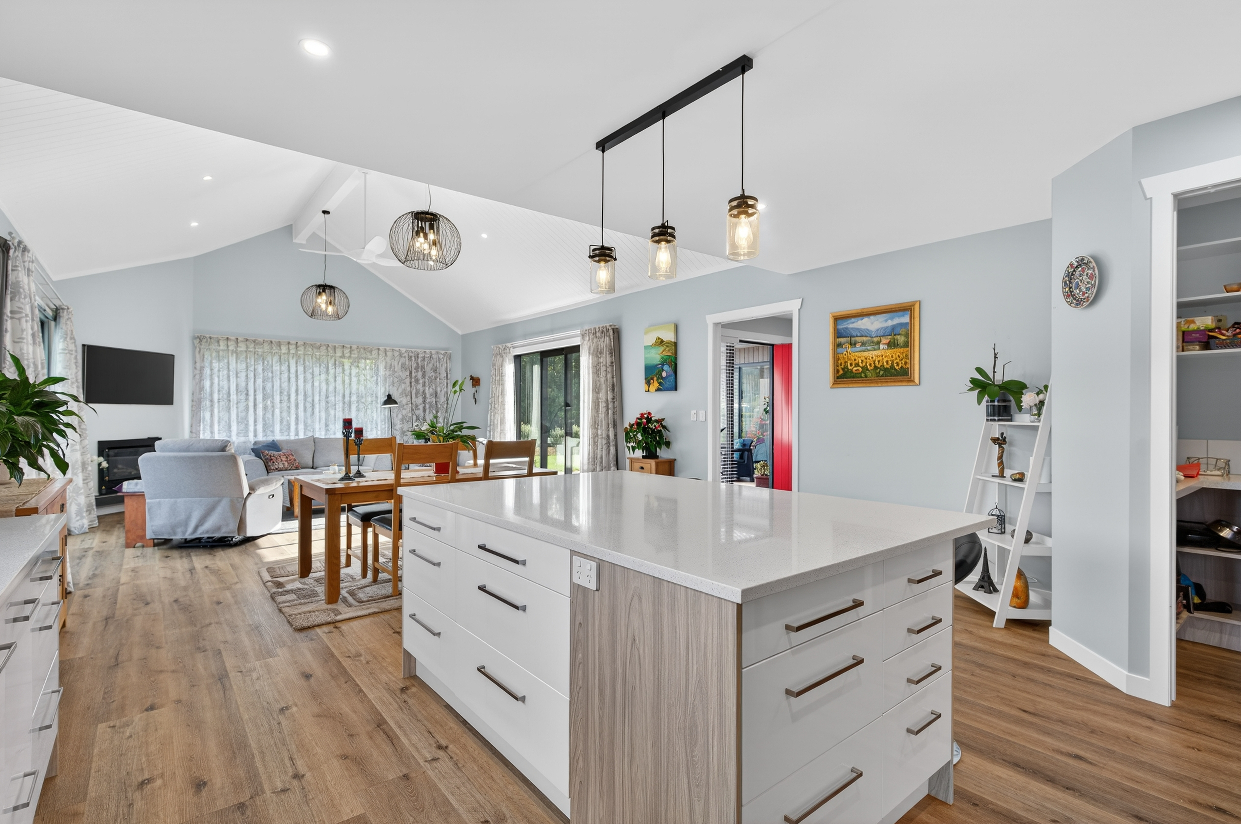 From the moment you arrive the welcoming foyer sets the tone, offering a stylish and practical entry. The heart of the home opens into a stunning, light-filled living space with high stud ceiling and an outlook to the Brynderwyns. Ranch sliders extend the living area on either side, out to two separate private decking zones and a Rinnai gas fireplace and designer lighting complete the picture.