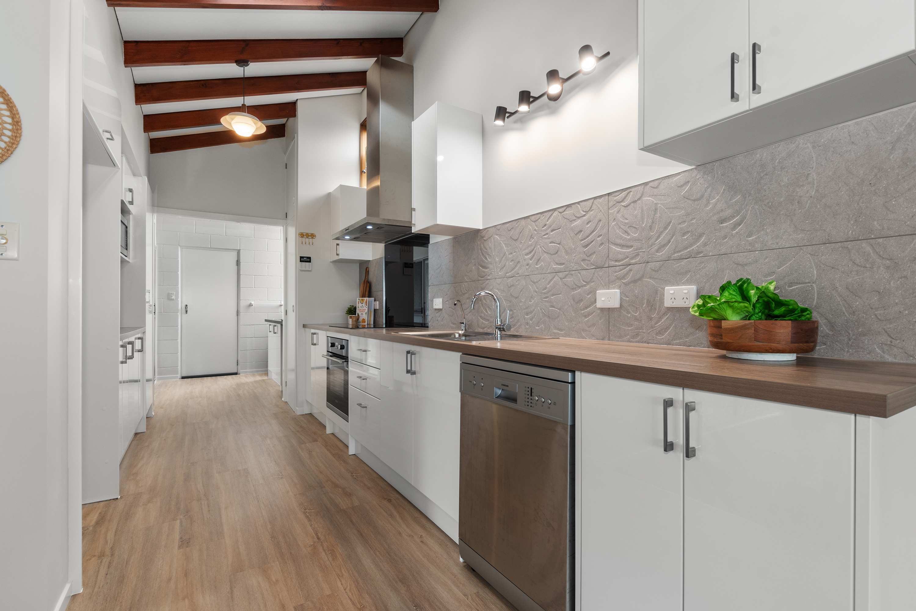 * Galley-style kitchen with generous bench space and a clever layout connecting to the living area.