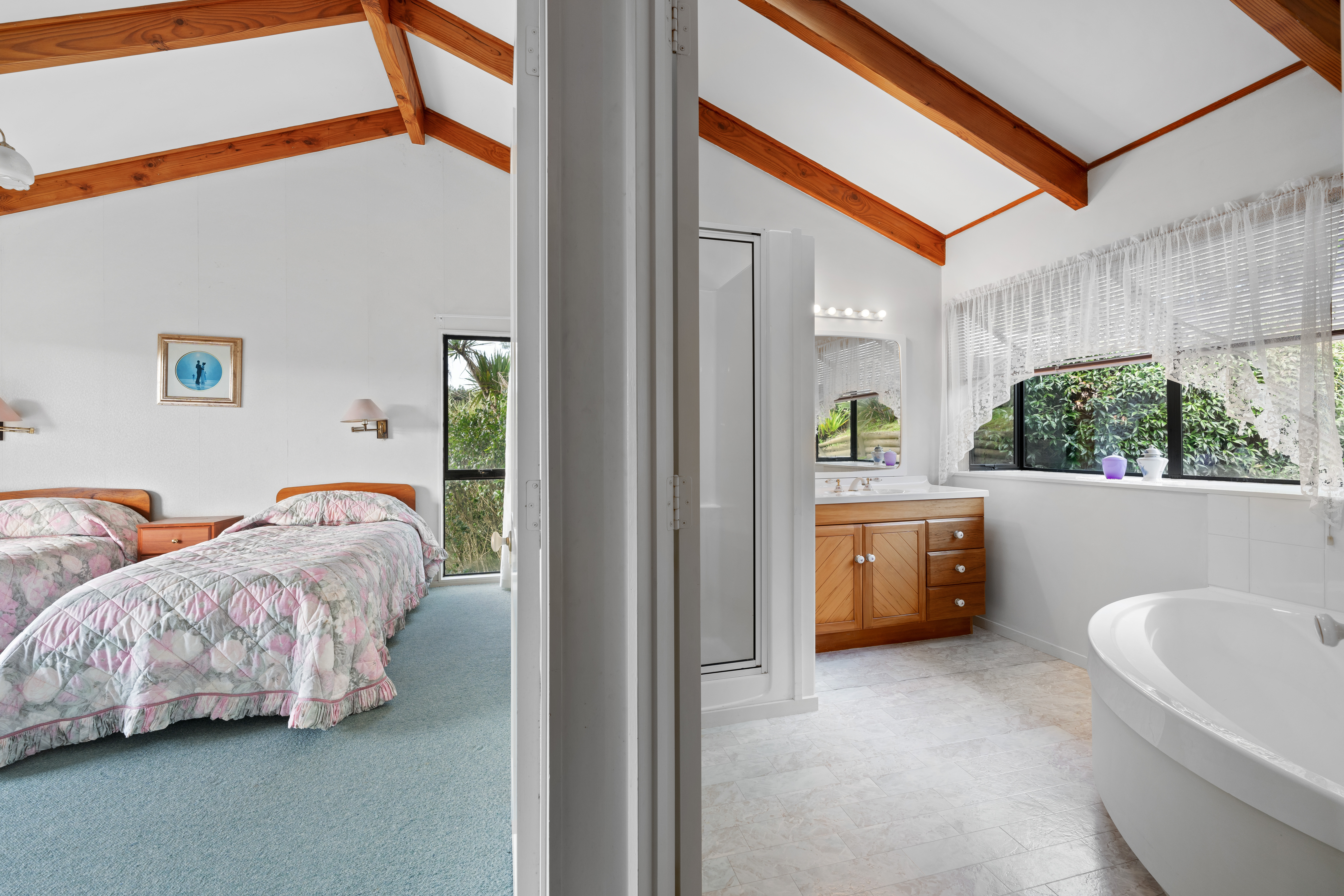 The three-bedroom, two-bathroom home features high-stud ceilings and generous glazing, creating a light-filled, open feel throughout. A spacious sunroom captures full sunshine and sweeping views through the oversized windows in the living area, making it the ideal spot for reading, relaxing, or simply soaking in the afternoon sun. The layout is practical, with strong bones and a warm, lived-in charm – but there’s serious potential to elevate, extend and modernize, or fully reimagine.