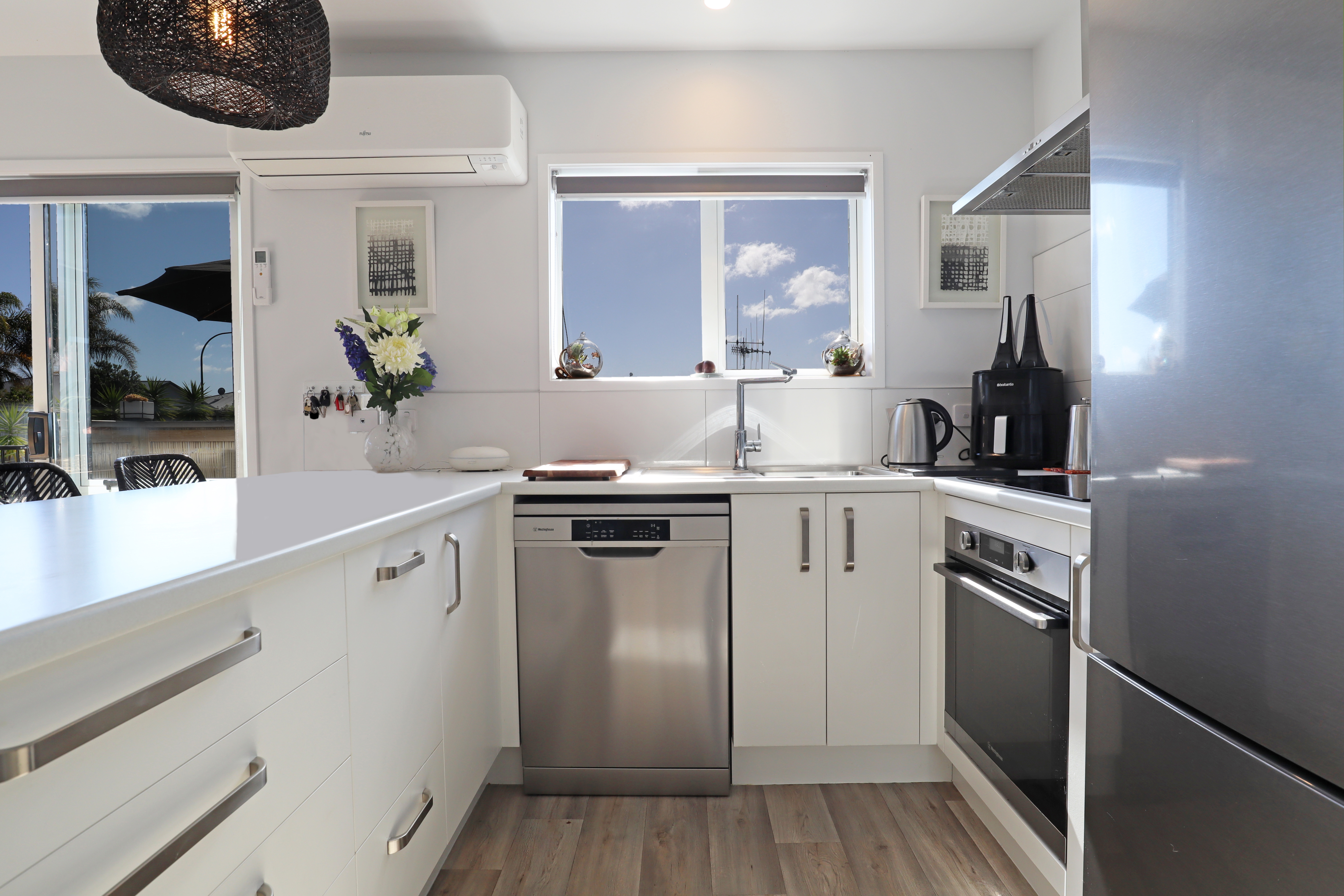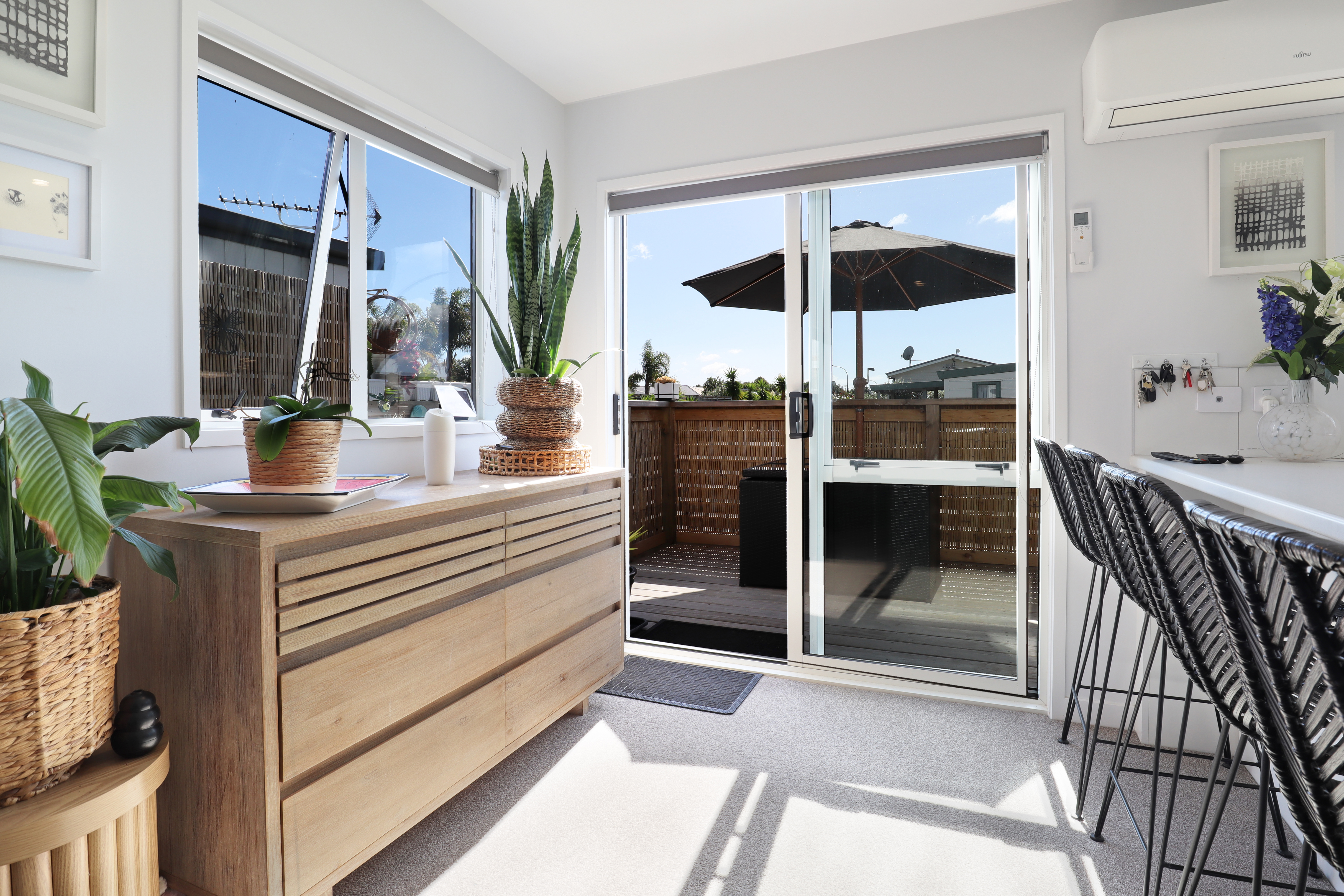 Inside, the open-plan kitchen and living area showcase new appliances and contemporary finishes, creating a welcoming and stylish space to enjoy. The combined lounge and dining area offers modern comfort and opens through doors to both north- and west-facing decks, ideal for indoor-outdoor living. The decked areas are fully fenced and suitable for a small furry companion (subject to management approval).
