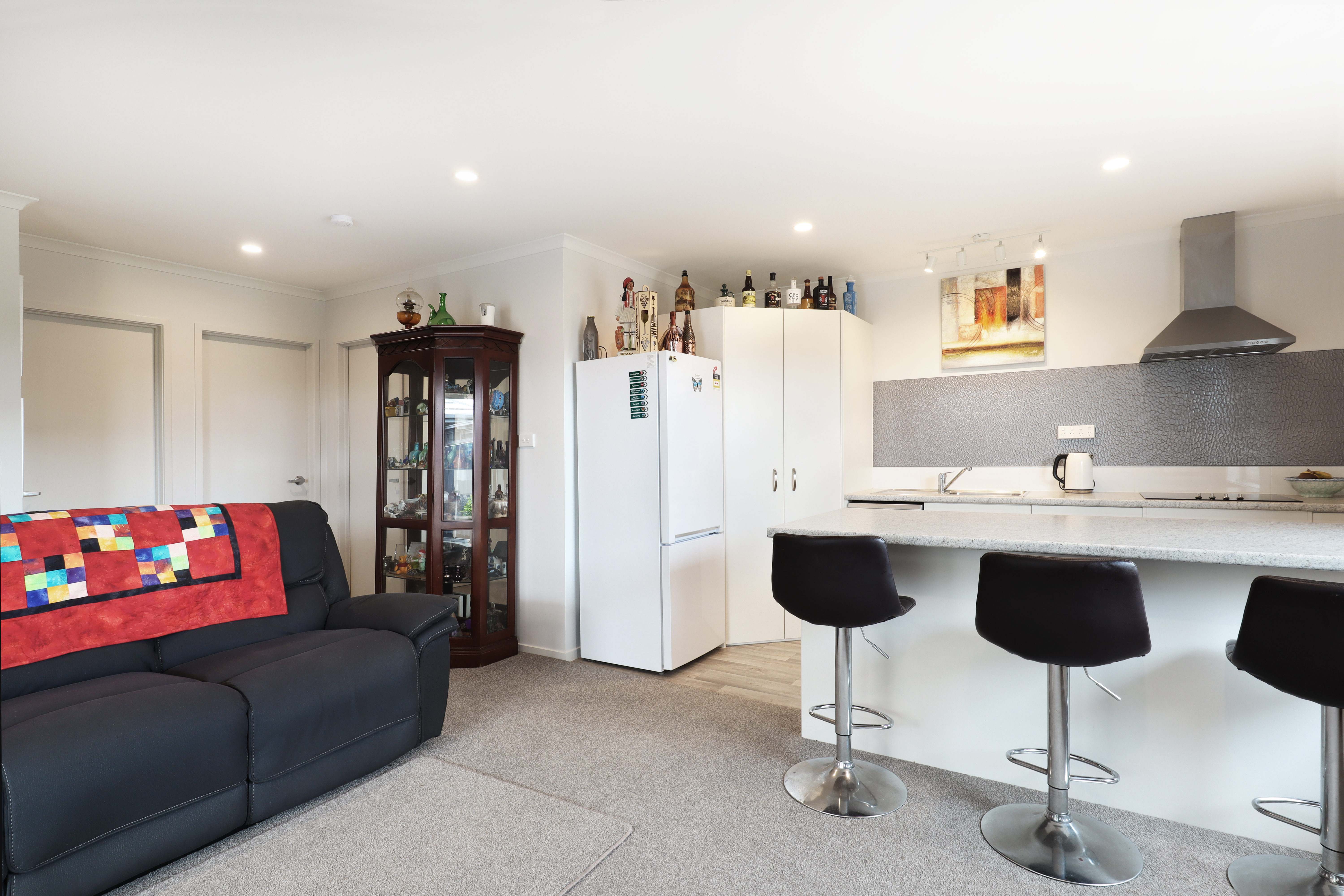 Step inside to a modern, well-appointed kitchen featuring a sleek splash back, range hood, waste disposal, dishwasher, and a highly sought-after breakfast bar complete with extra drawer storage. The open-plan kitchen and lounge flow seamlessly together, kept comfortable year-round with a heat pump. A mesh security door allows fresh air to circulate while keeping insects out-perfect for Papamoa’s warm summer days.