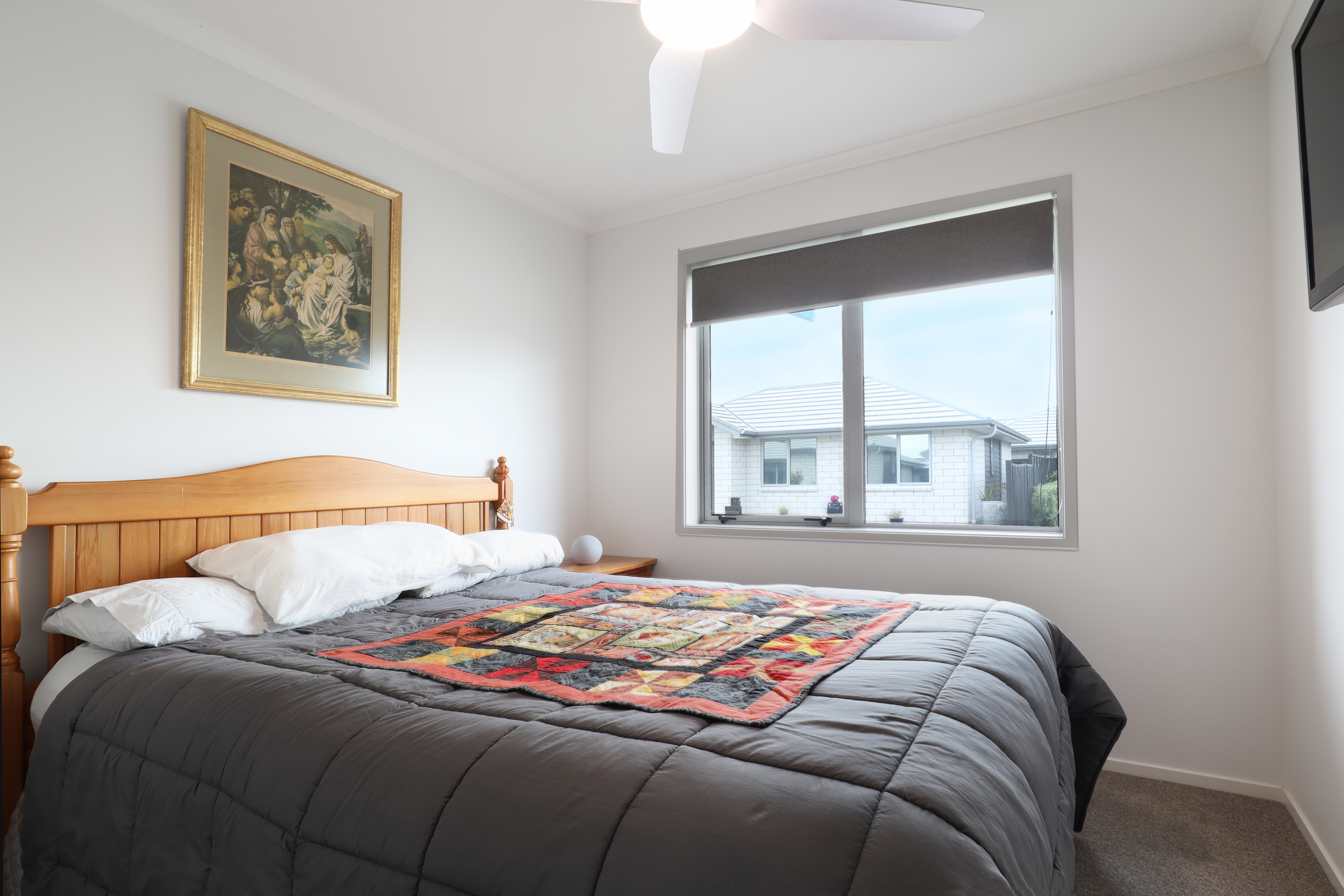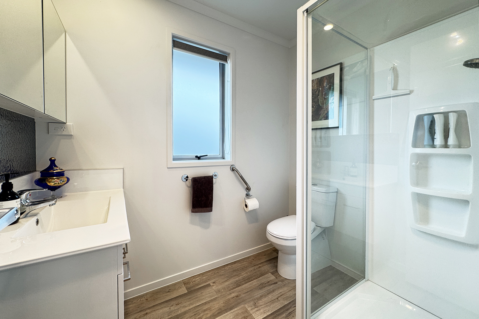 Both queen-sized bedrooms offer tinted windows for privacy, with the master enjoying a ceiling fan for restful nights. Each wardrobe is fitted with wire shelving and shoe racks for smart organisation. The bathroom includes a convenient shower dome to reduce condensation and a handy cabinet above the basin.