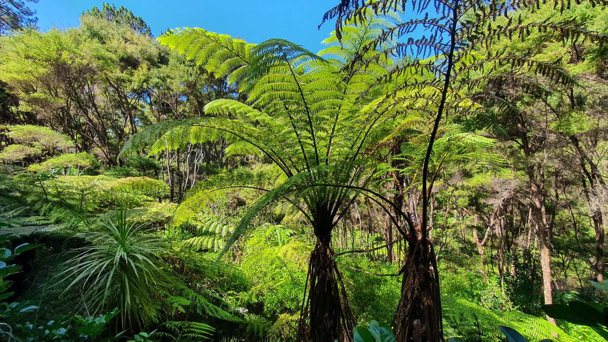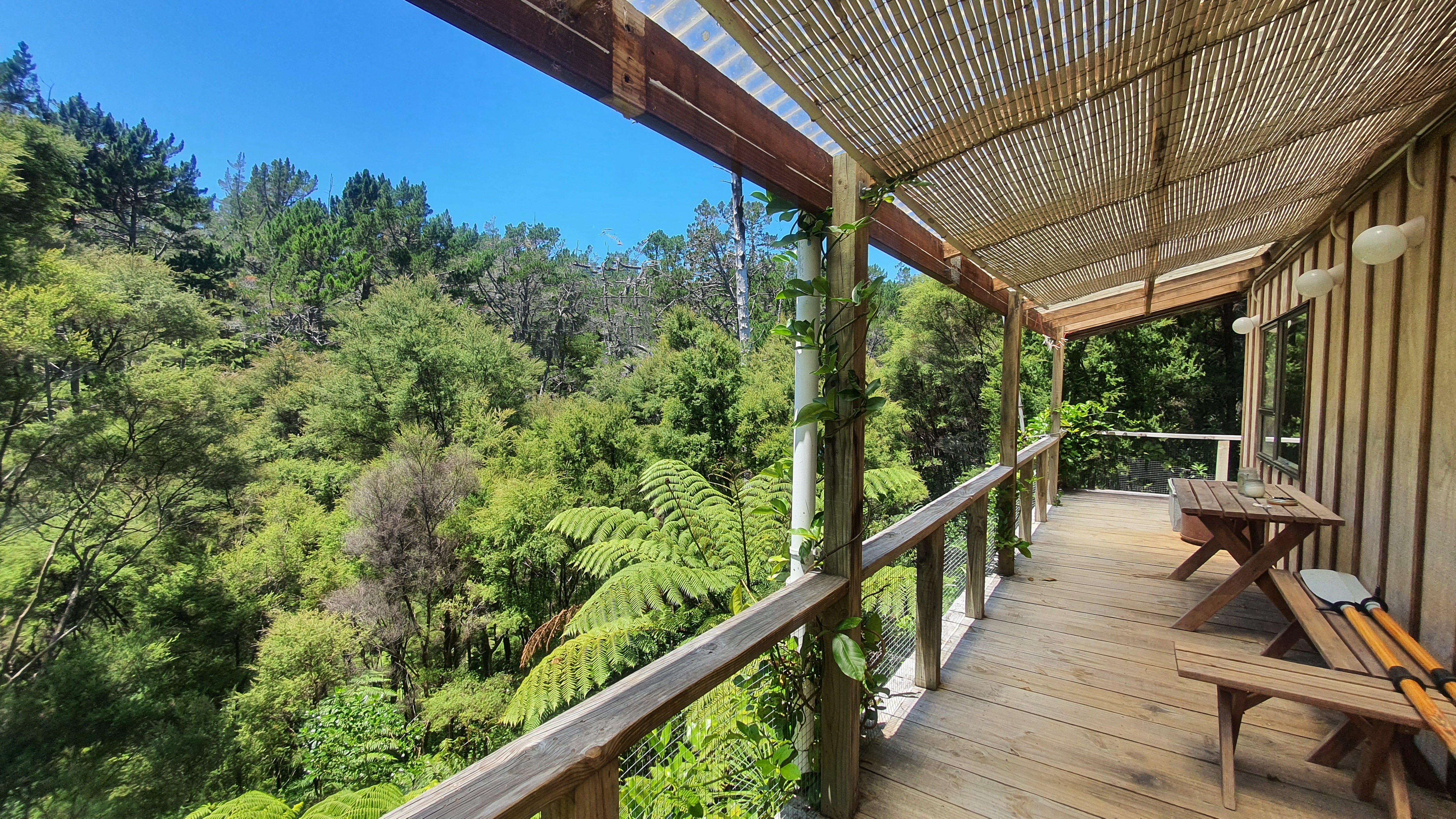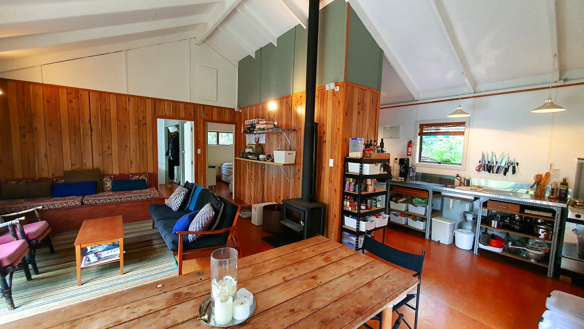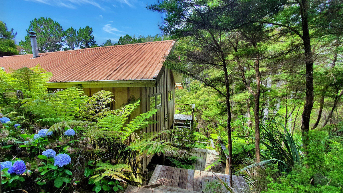 Step onto the long, sun-drenched deck and you’re immediately surrounded by nature: towering tree ferns, dappled light, and the soft movement of the forest. Inside, you’ll find a charming open-plan living area with high ceilings, timber accents, and a cosy wood burner. Two comfortable bedrooms plus a separate sleepout mean there is plenty of space for family and friends. This is the kind of place where weekends stretch out, afternoons drift into evenings on the deck, and life slows to island time.