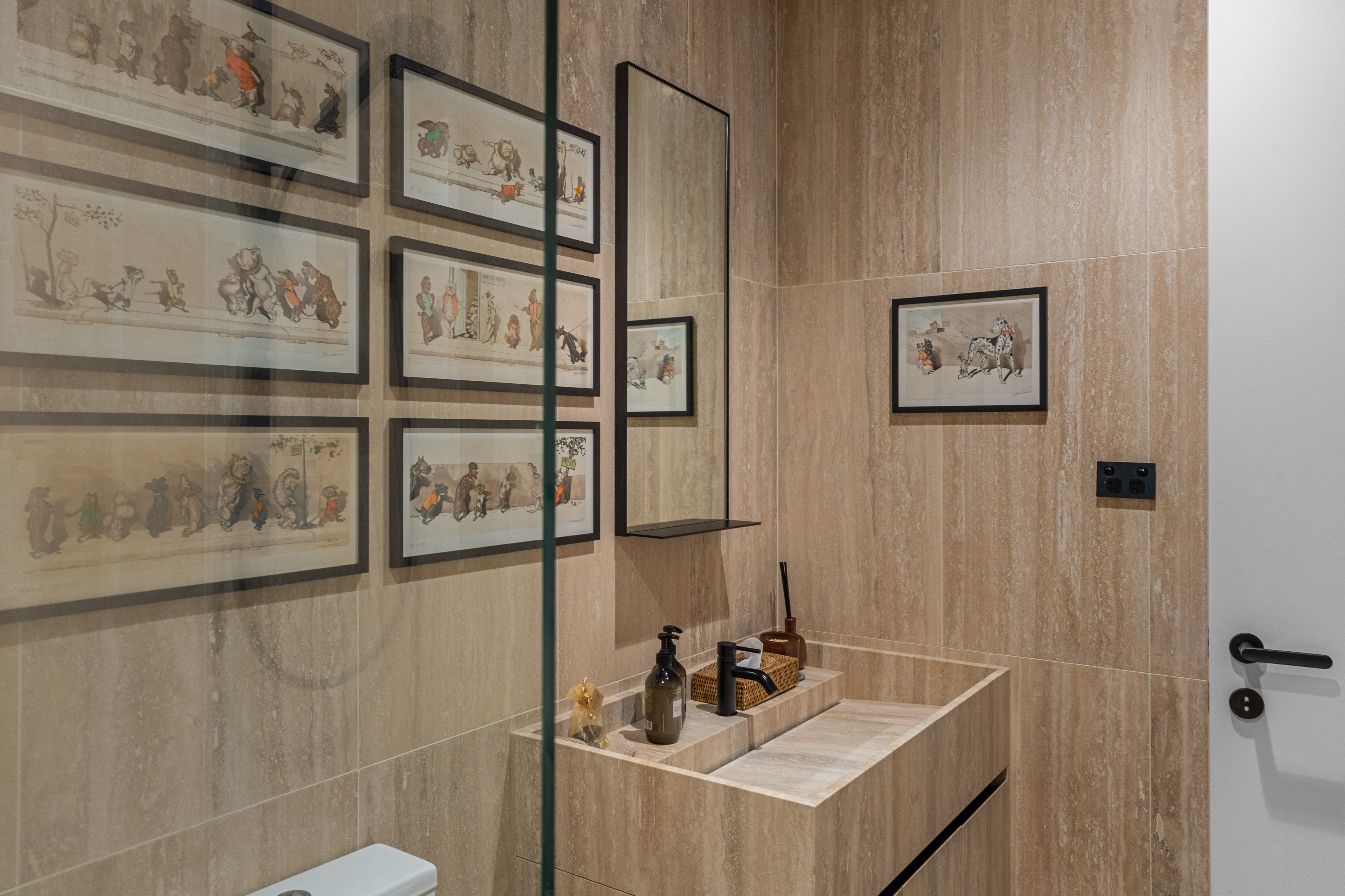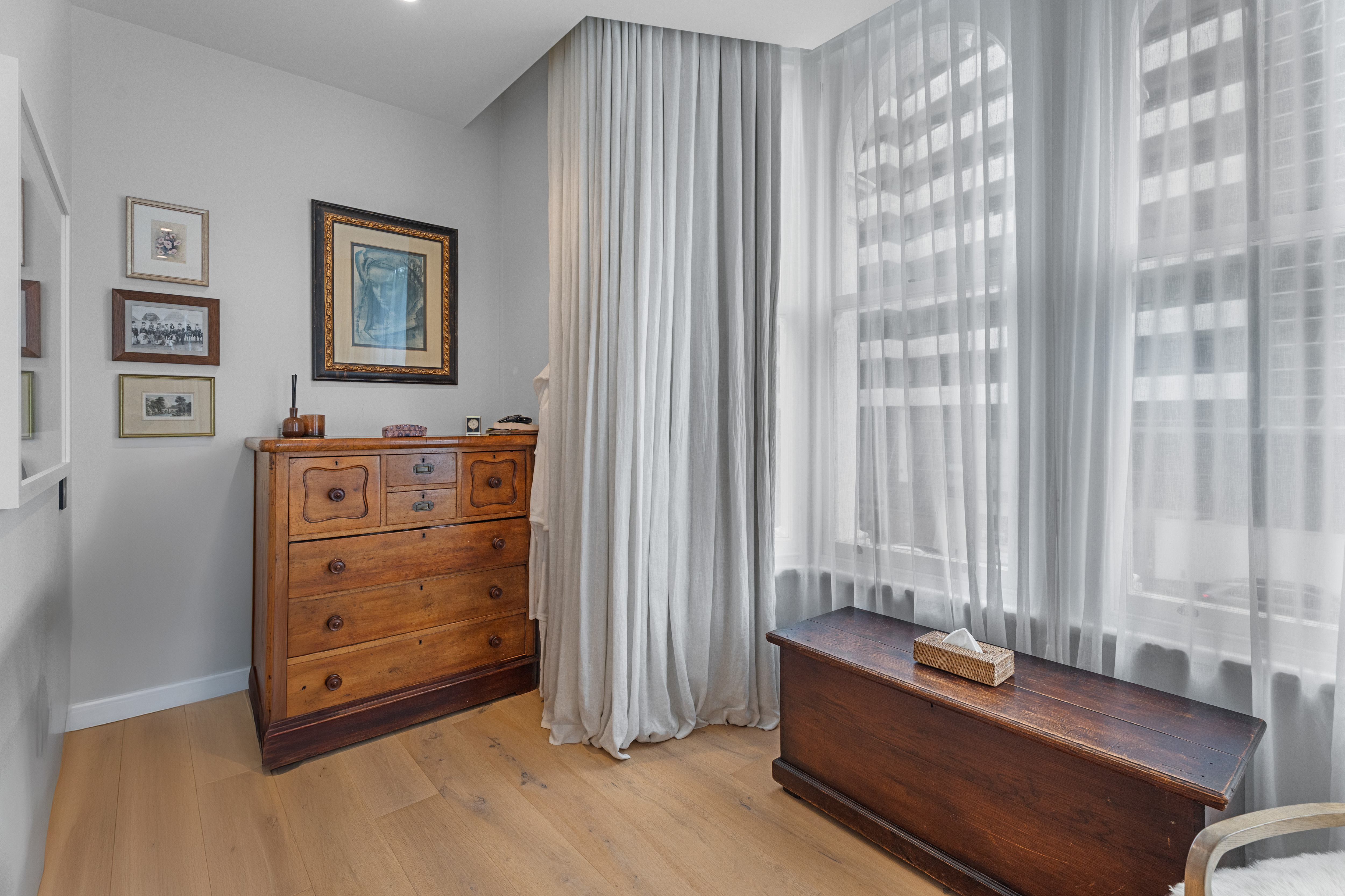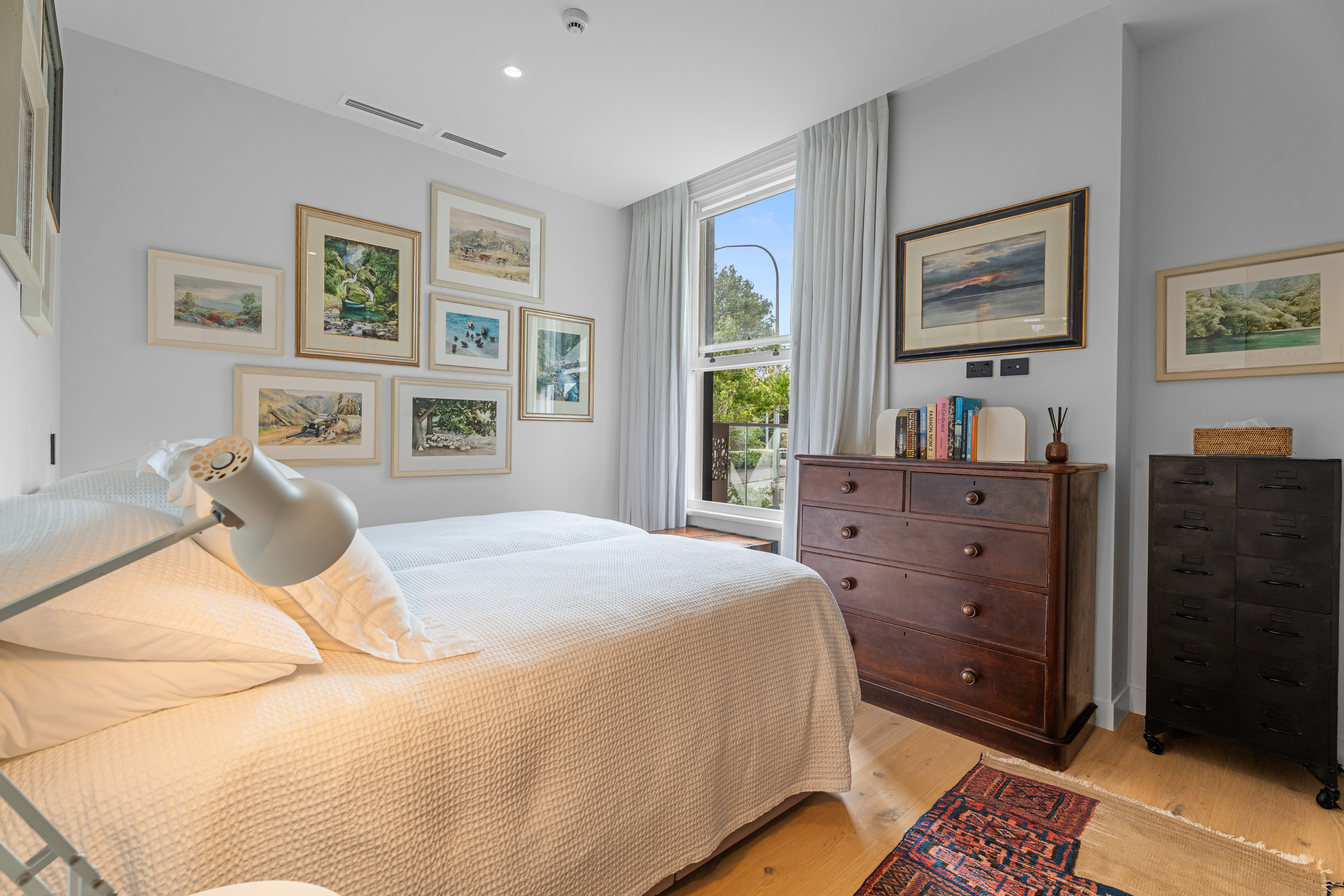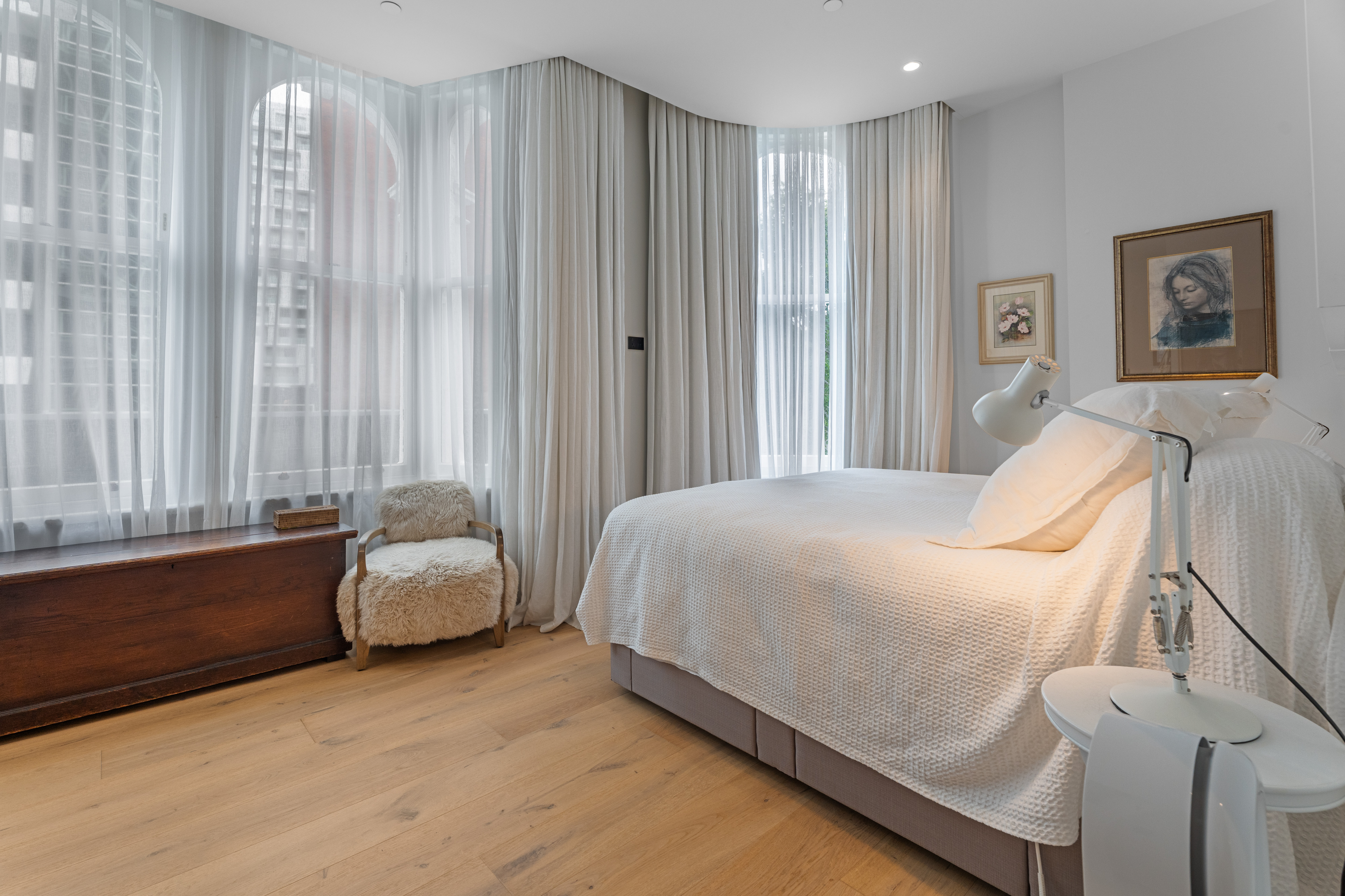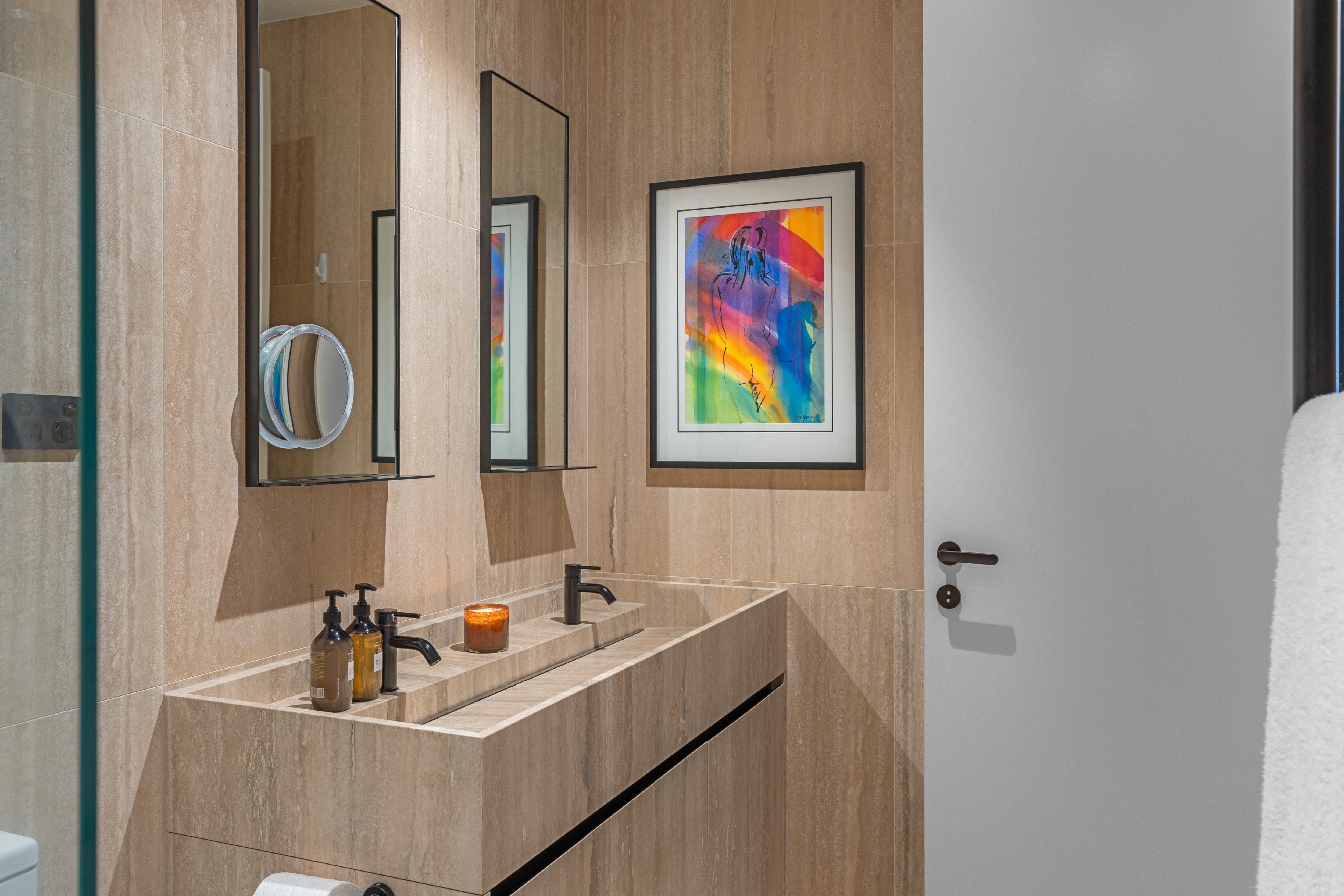 Two tranquil bedrooms include a superb master suite, enhanced by the romantic curves and deep-set windows of the original heritage façade. Its walk-in robe and travertine-clad ensuite create an everyday retreat of understated indulgence. A second full bathroom, also resplendent in floor to ceiling travertine, echoes the hotel standard detailing found throughout.
