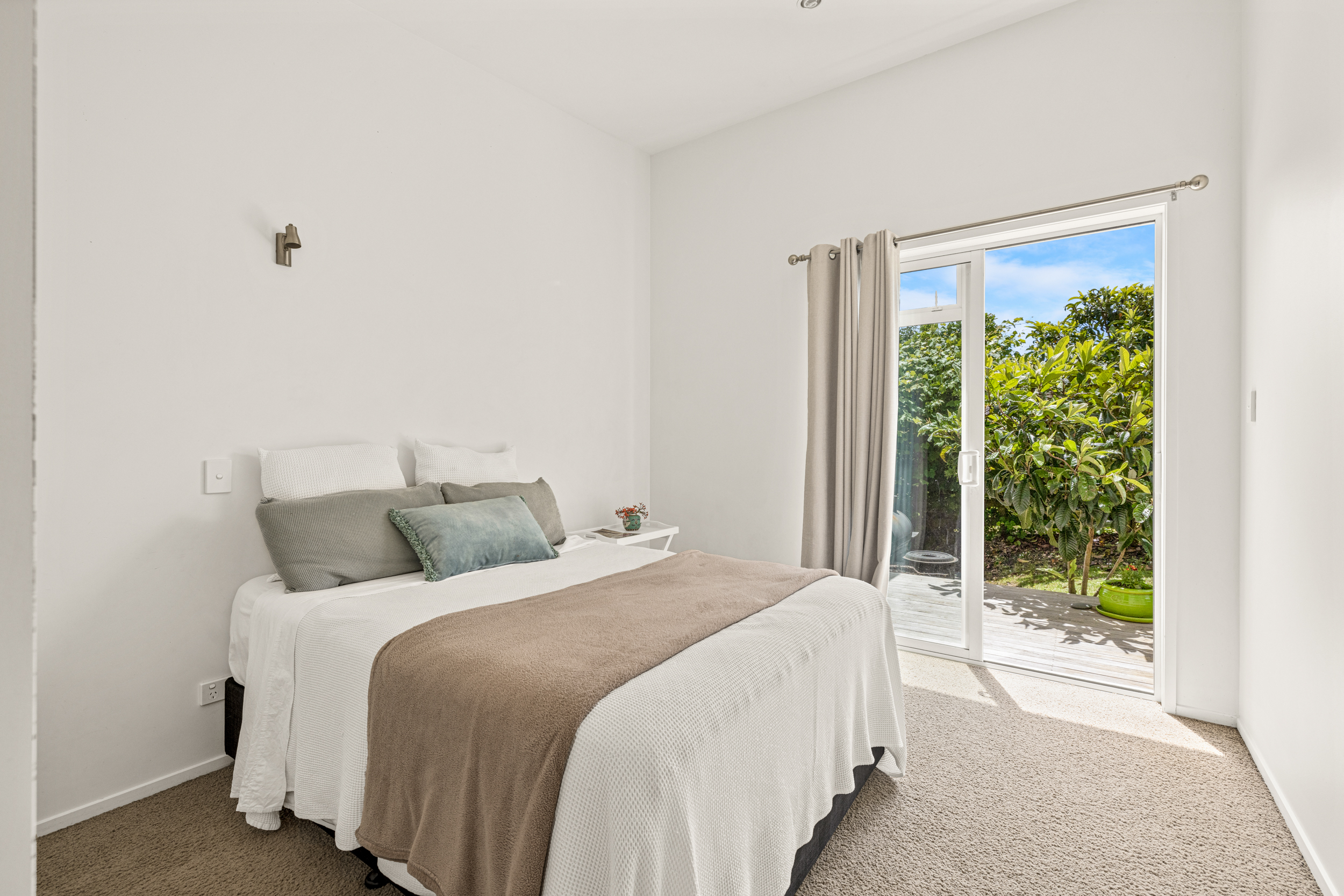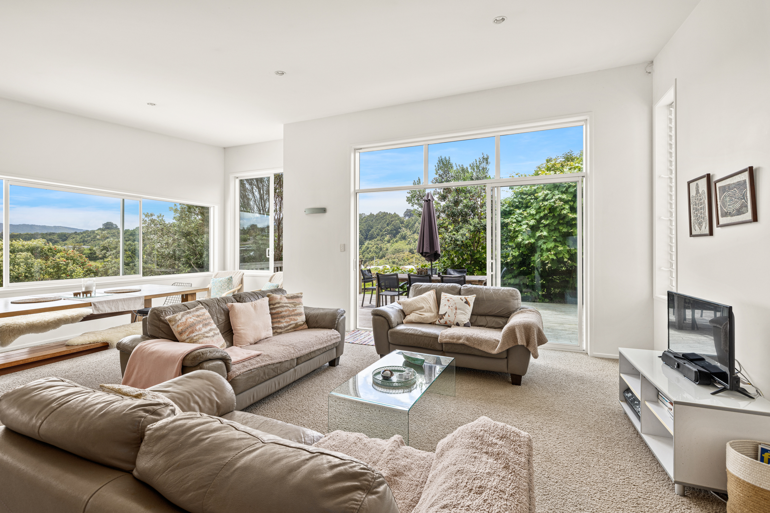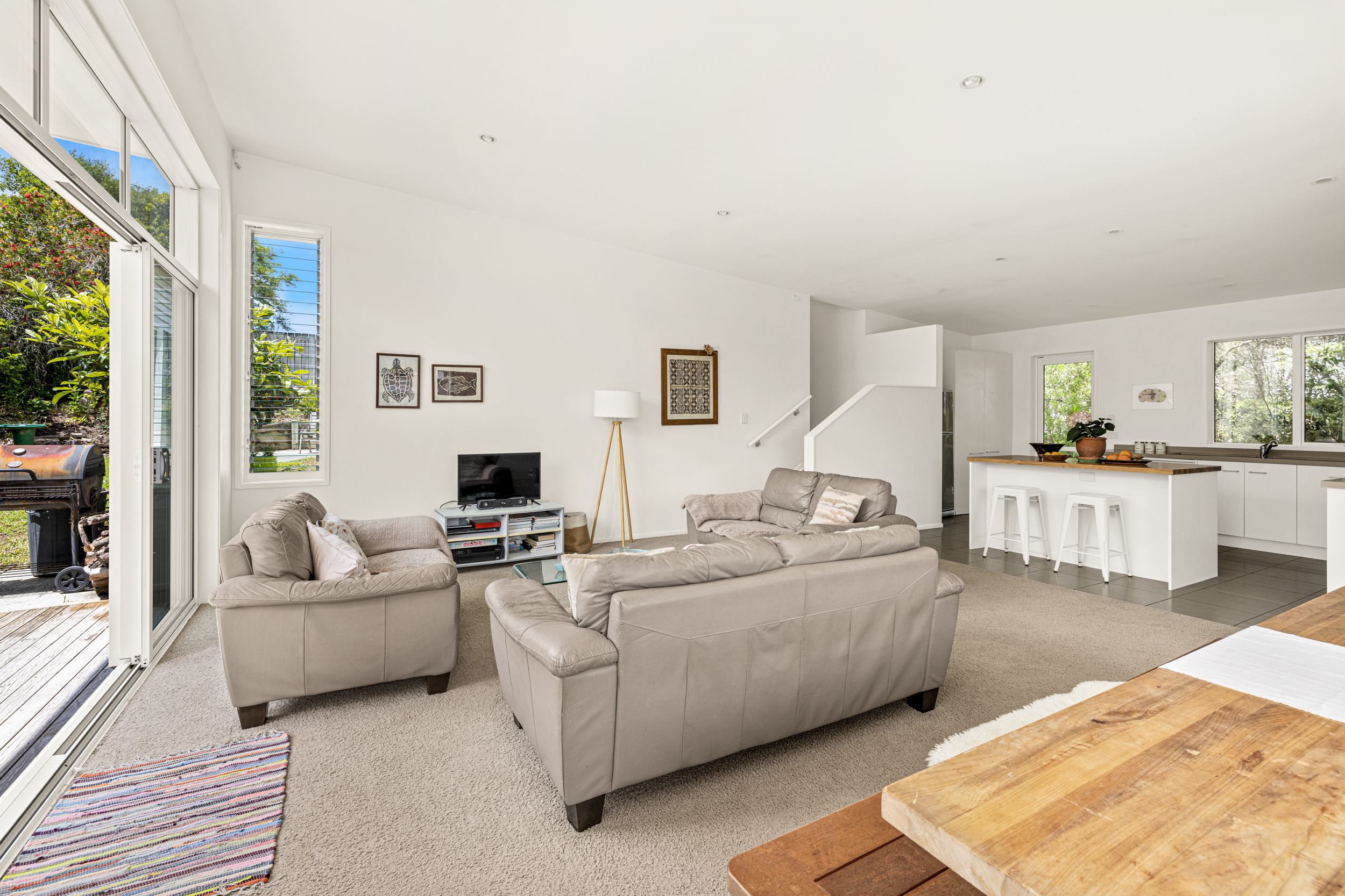 Inside, the home includes four bedrooms, including a primary suite with walk-in wardrobe and ensuite, plus a main bathroom and an additional bathroom adjacent to the downstairs office/bedroom. A formal entry leads to an open-plan kitchen with an island bench, dining and living area with generous storage and a gas hob, opening to outdoor decking on both sides of the home. Heating is provided by a heat pump. The whole home is light filled enhancing the high ceilings throughout.