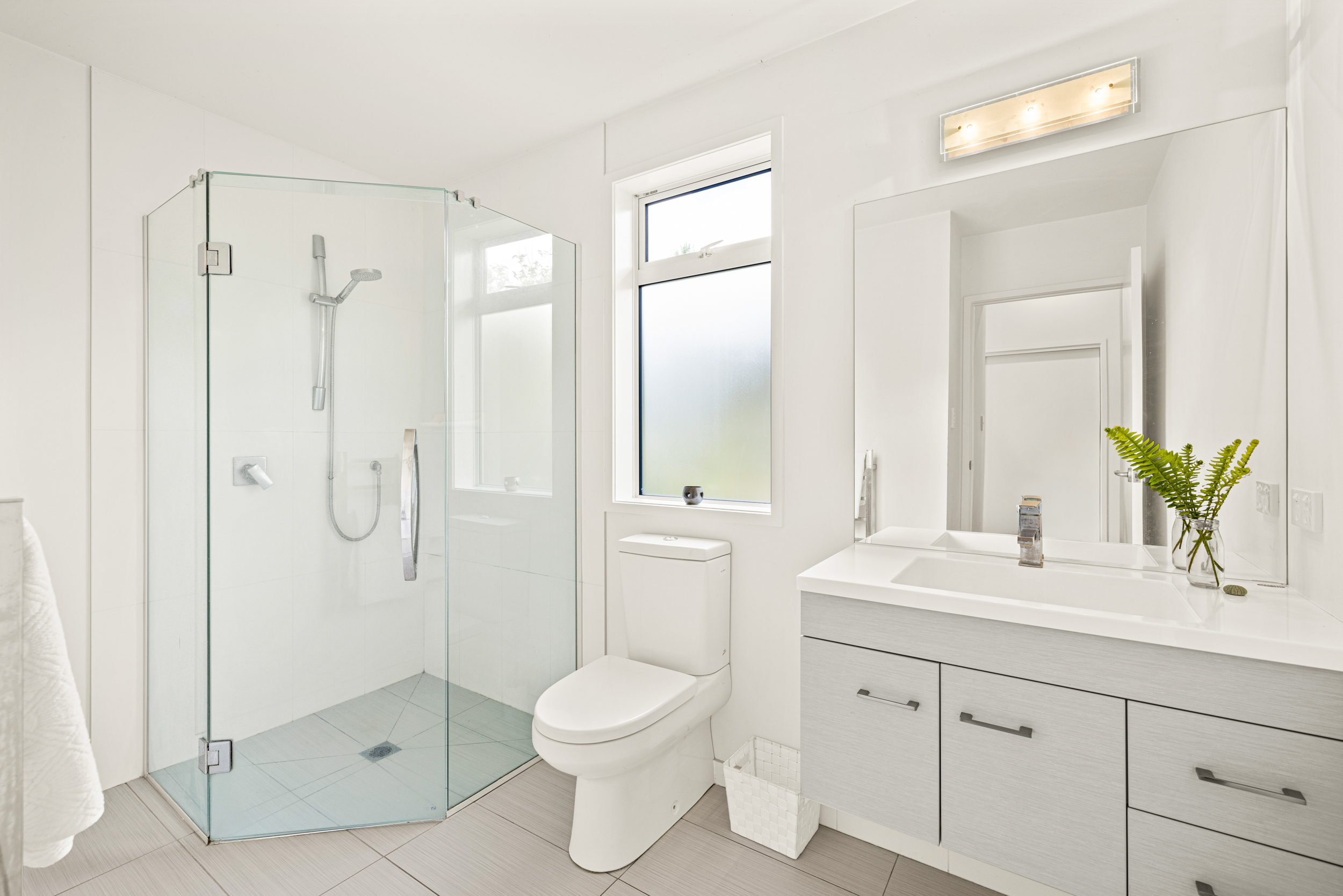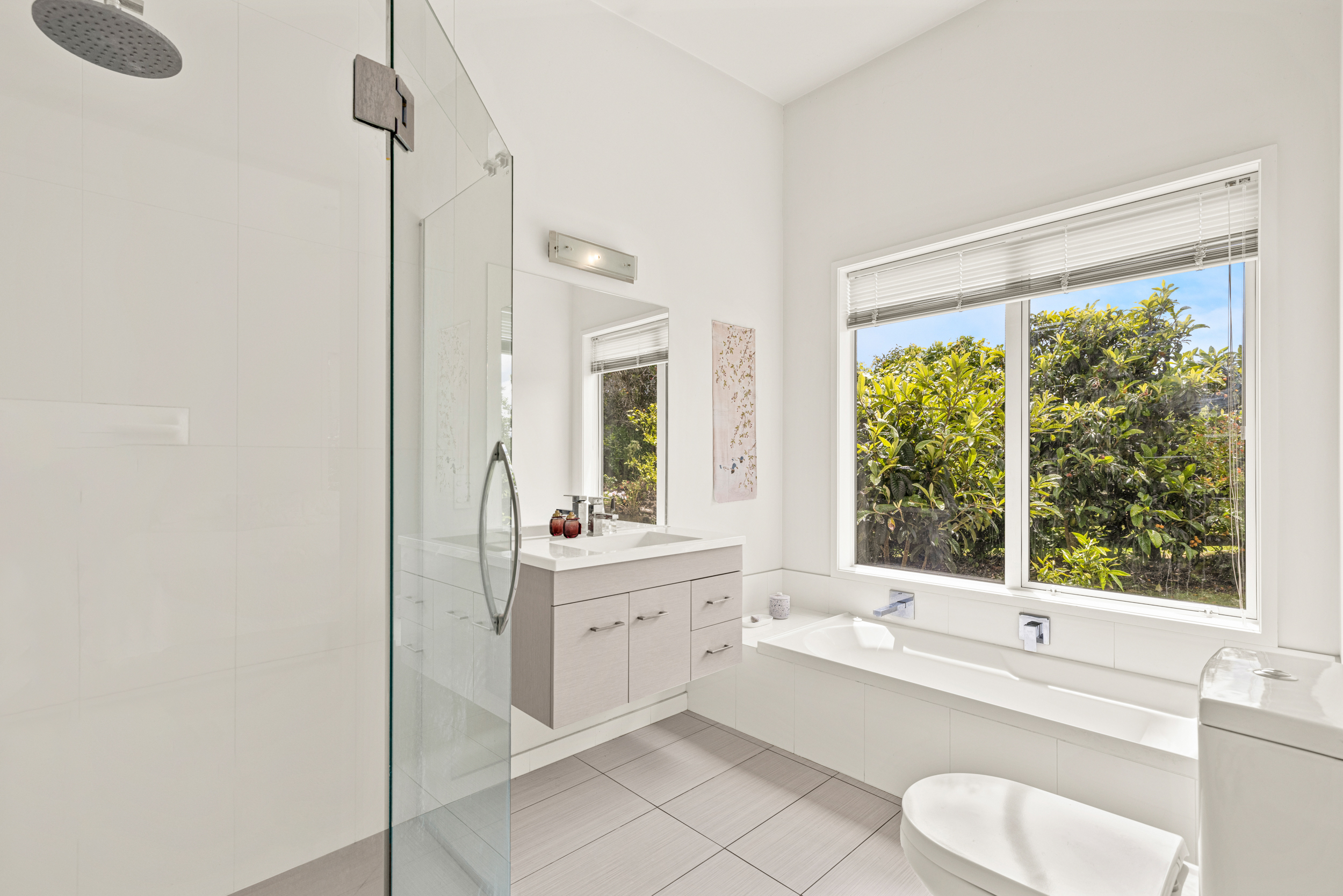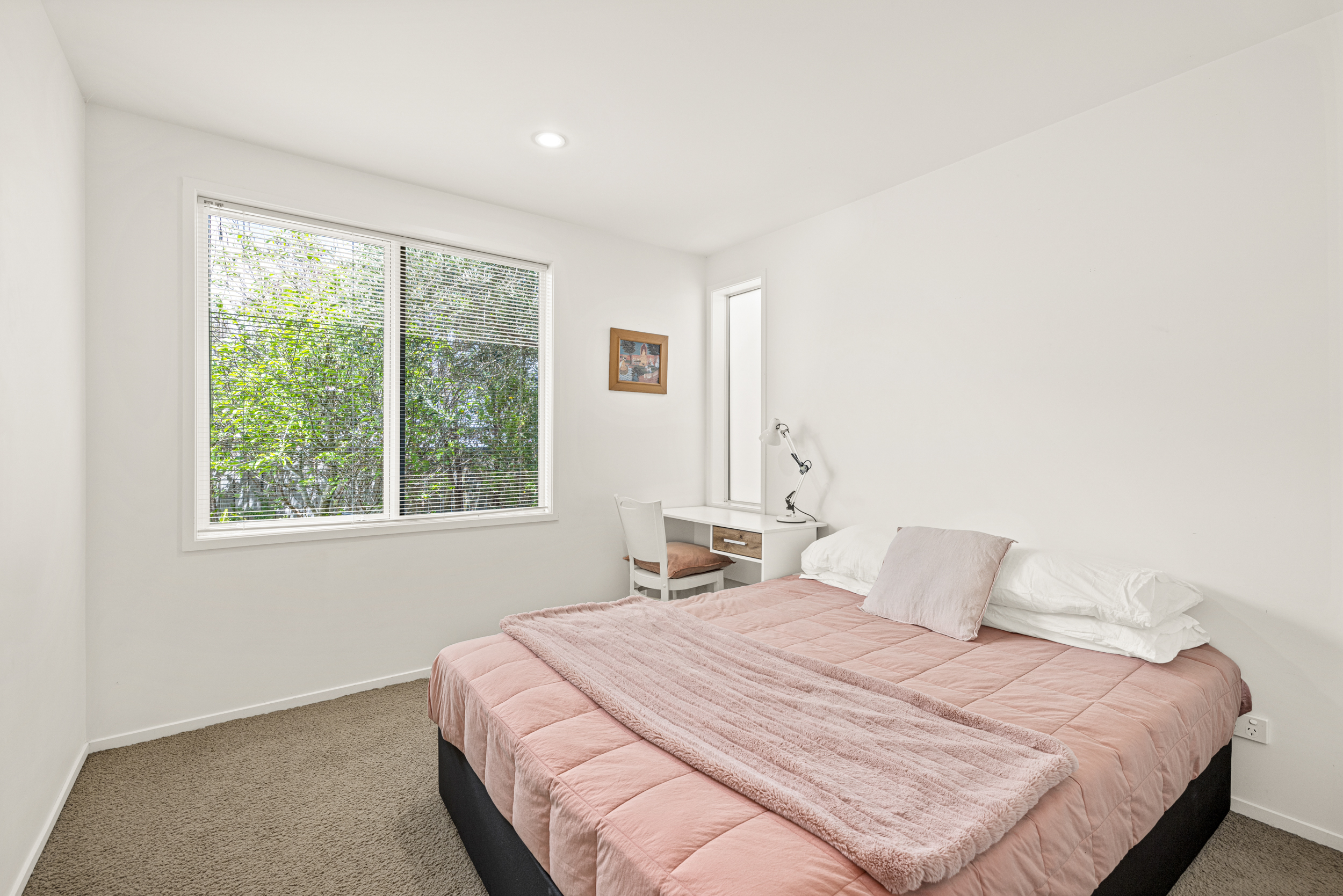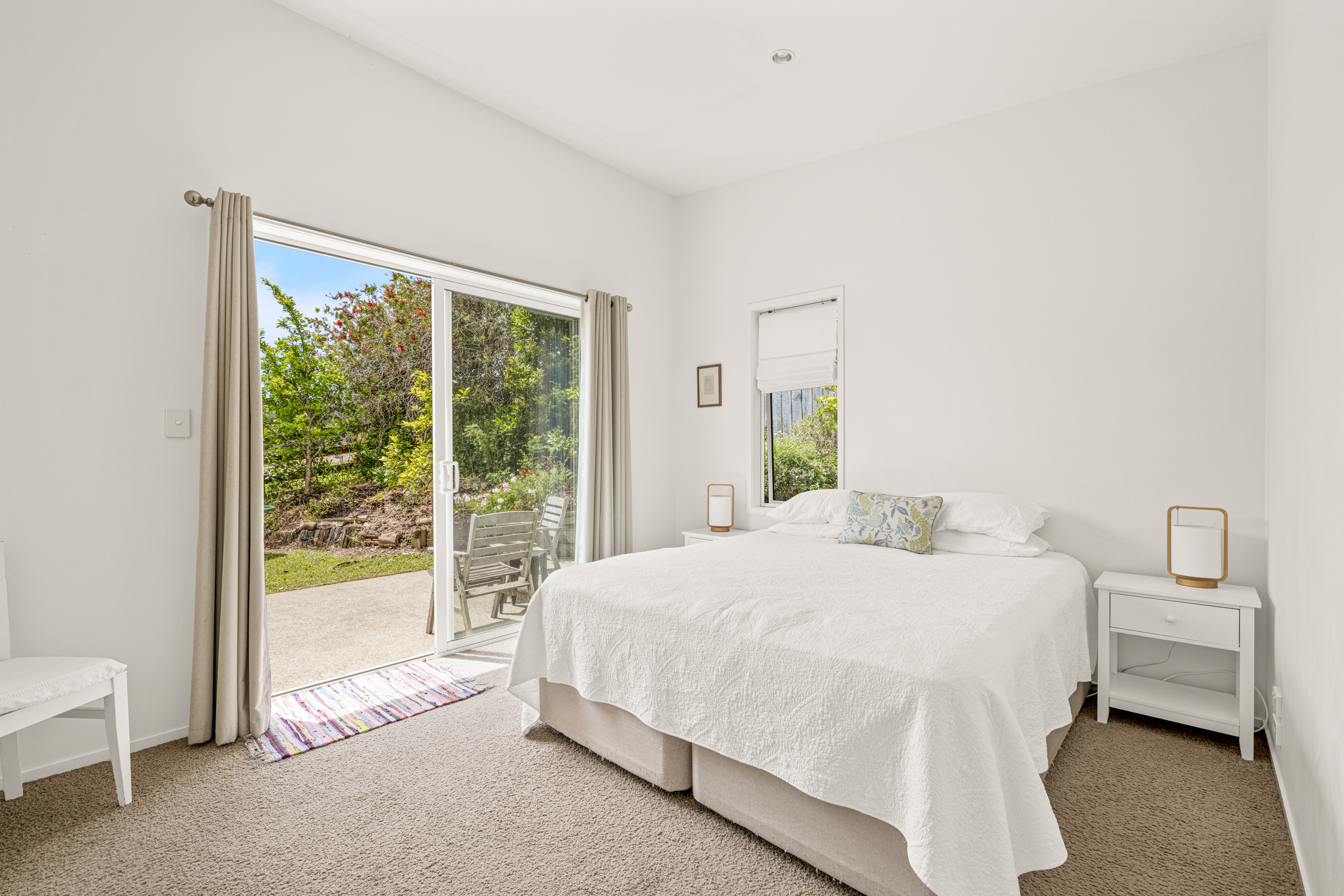 Inside, the home includes four bedrooms, including a primary suite with walk-in wardrobe and ensuite, plus a main bathroom and an additional bathroom adjacent to the downstairs office/bedroom. A formal entry leads to an open-plan kitchen with an island bench, dining and living area with generous storage and a gas hob, opening to outdoor decking on both sides of the home. Heating is provided by a heat pump. The whole home is light filled enhancing the high ceilings throughout.