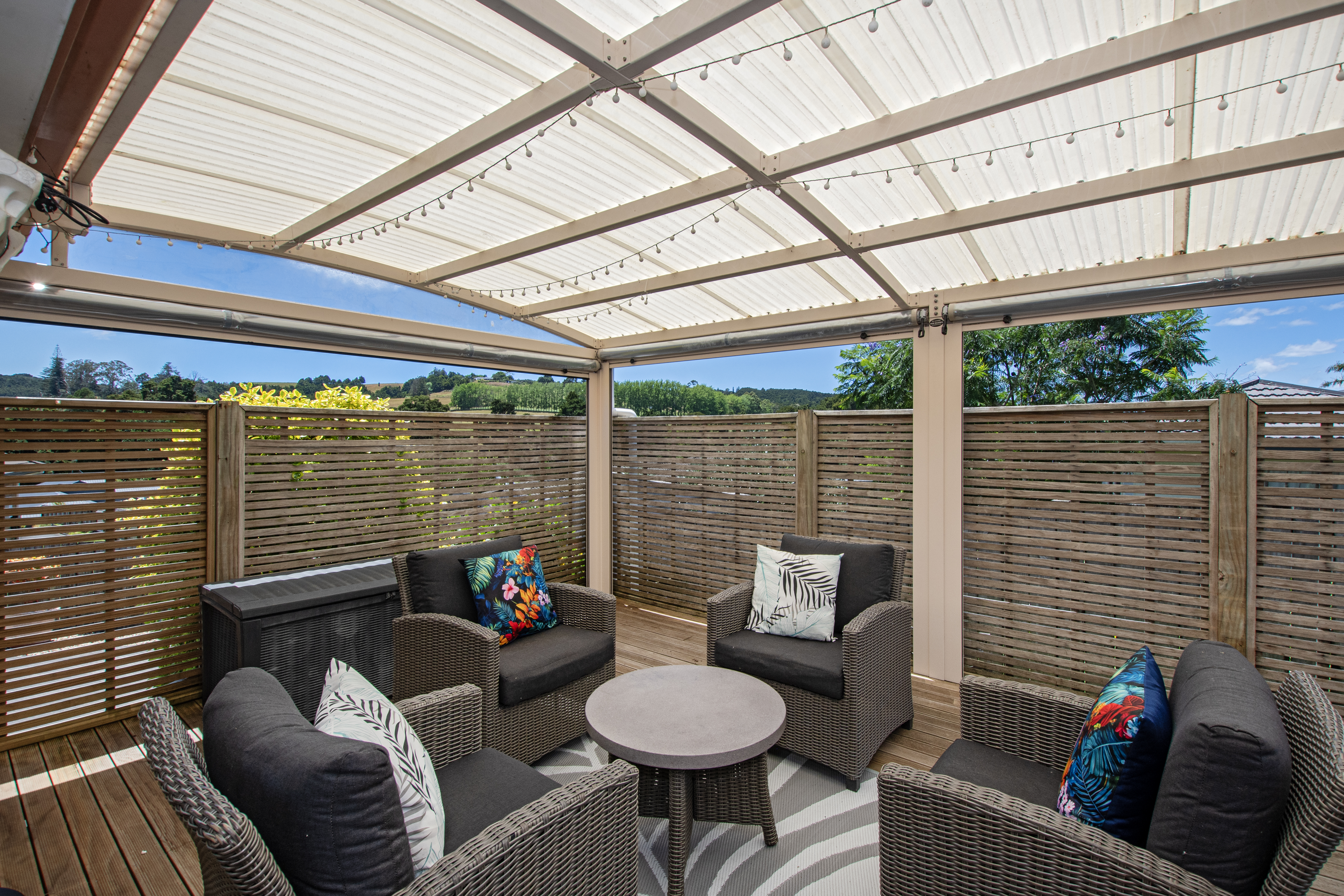 * Covered pergola off the lounge with roll-down blinds and privacy screens, creates a sheltered outdoor room all year round