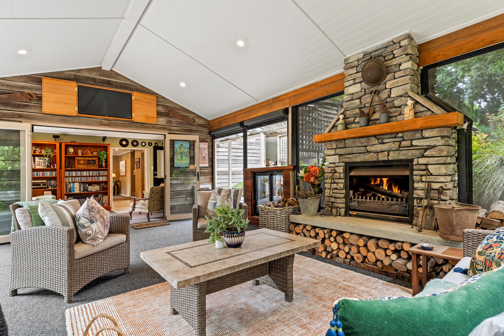 Arranged over three levels, the top floor offers two well proportioned bedrooms and a family bathroom; the middle level features a flexible room ideal as a study or extra bedroom, the master suite with walk in robe and ensuite, plus a separate laundry. The lower level is the social hub: open living, a central kitchen, dining area and music room flow through large glass bi folds to an elevated entertainer’s pavilion that opens onto lush greenery for a tranquil ambience. A commanding stone fireplace anchors the pavilion with rugged elegance – perfect for slow afternoons by the fire – while a concealed built in screen and integrated bar fridge make hosting effortless. The entire lower floor opens to a generous east facing deck overlooking the pool for seamless indoor/outdoor living year round, aided by large drop down blinds.
