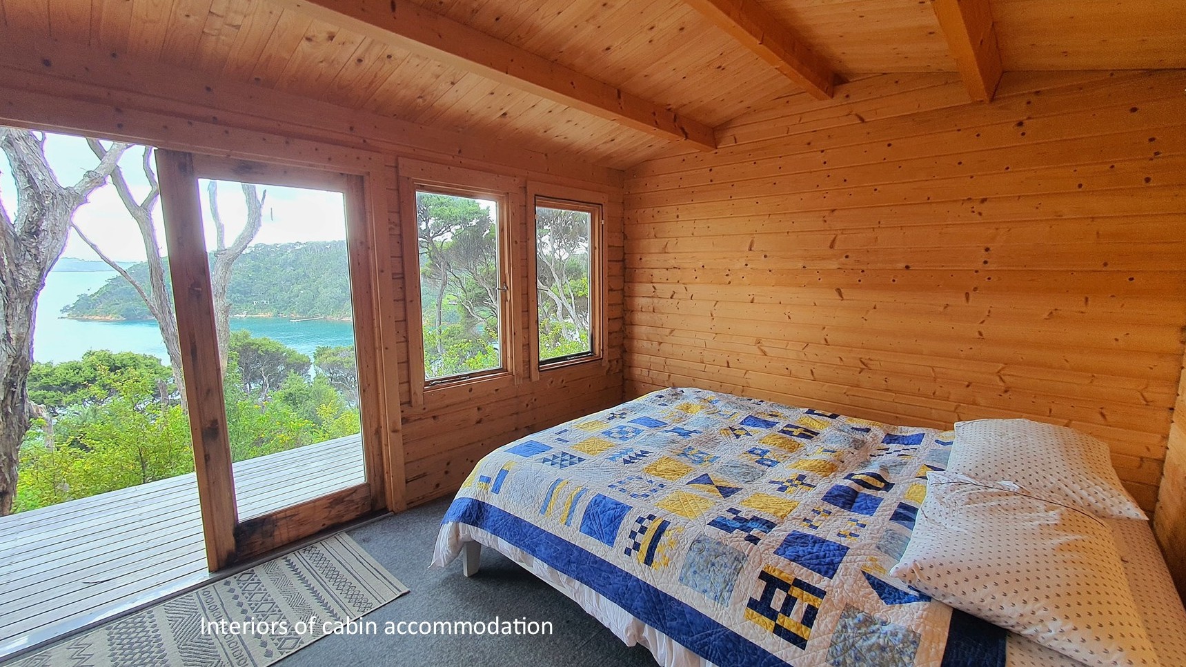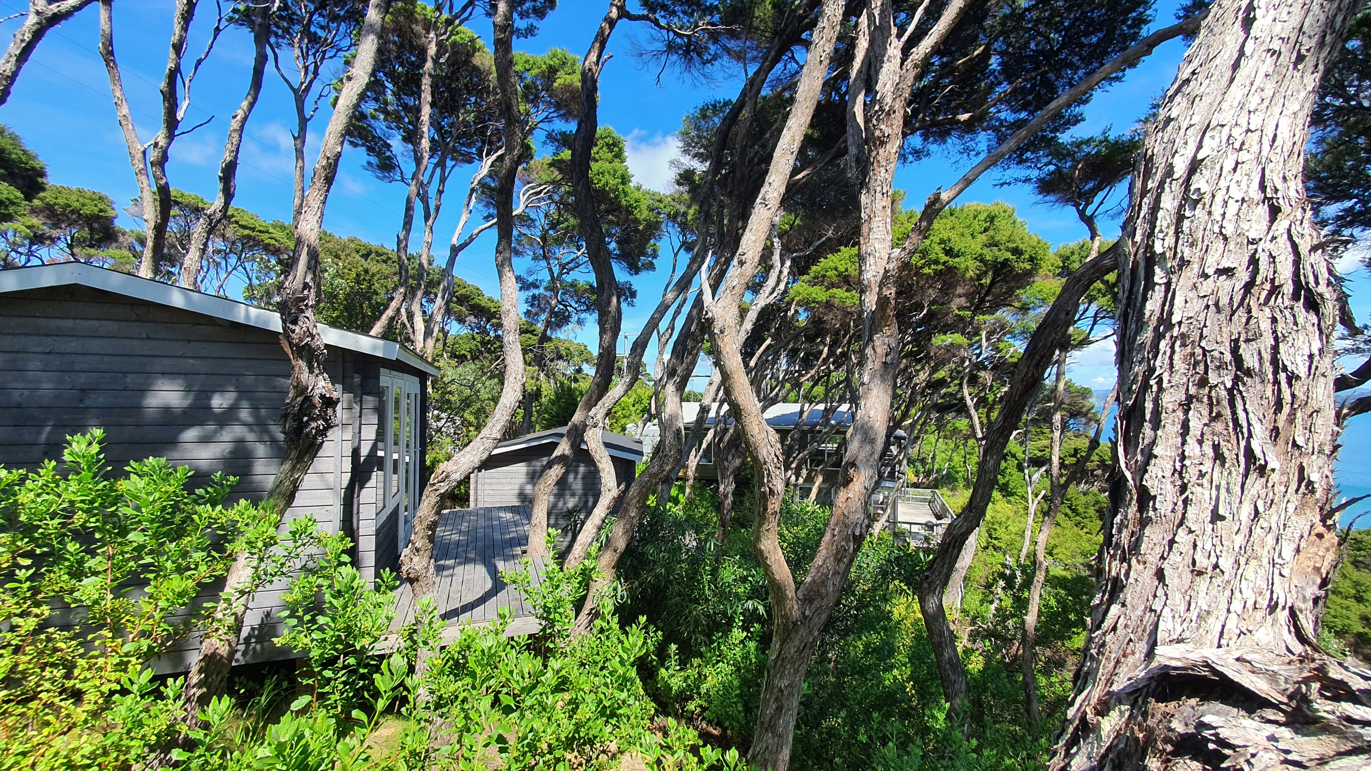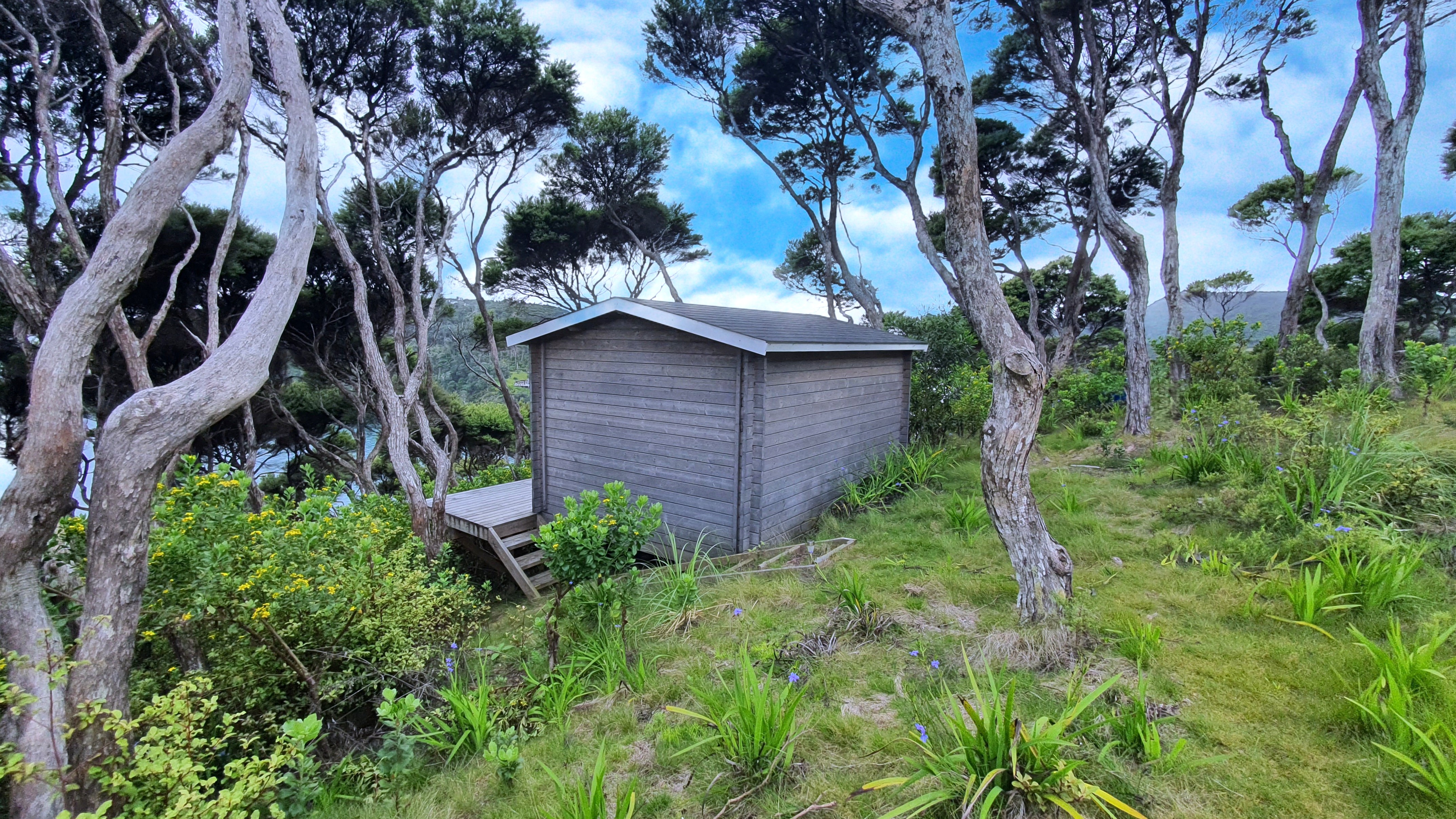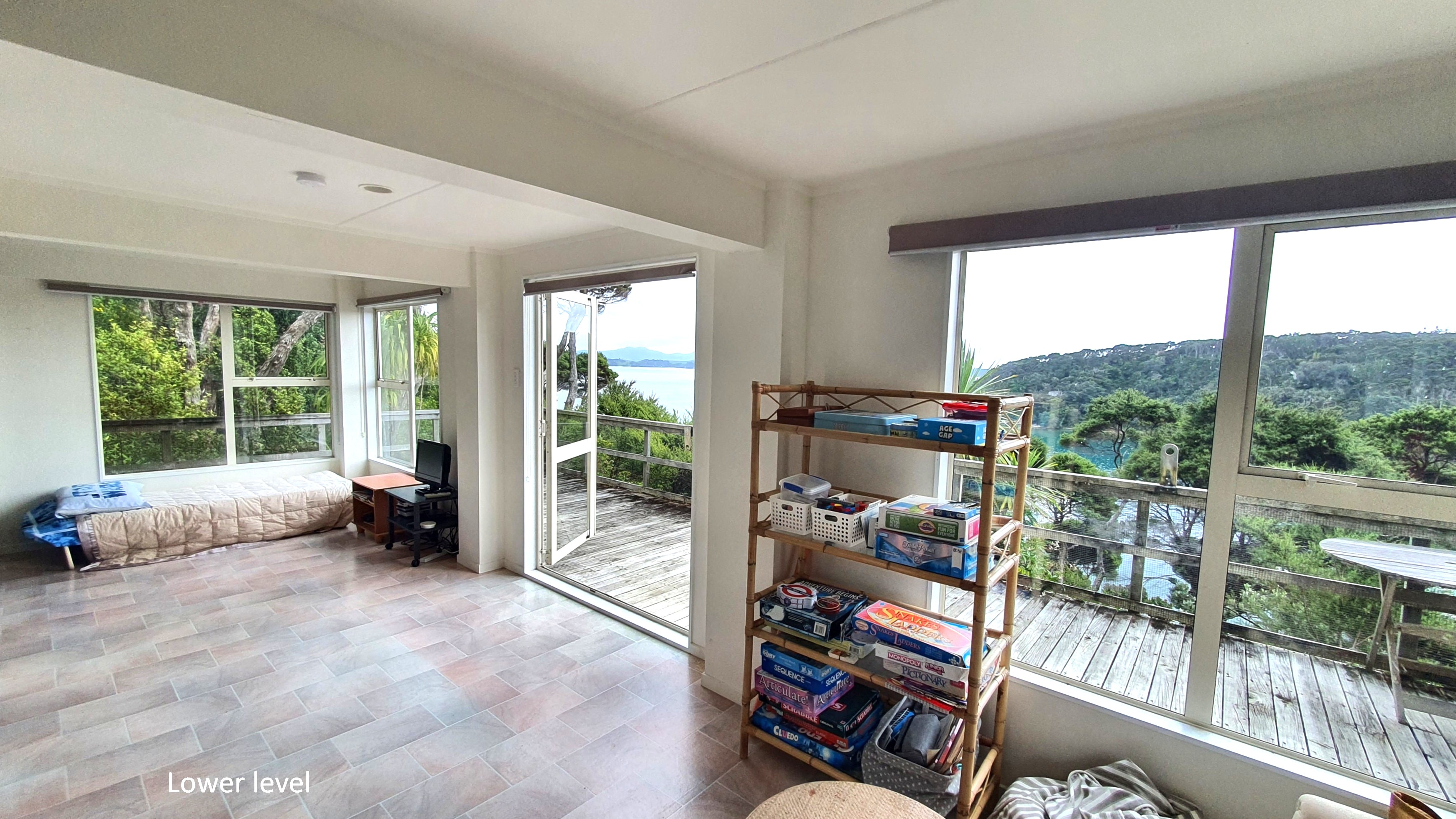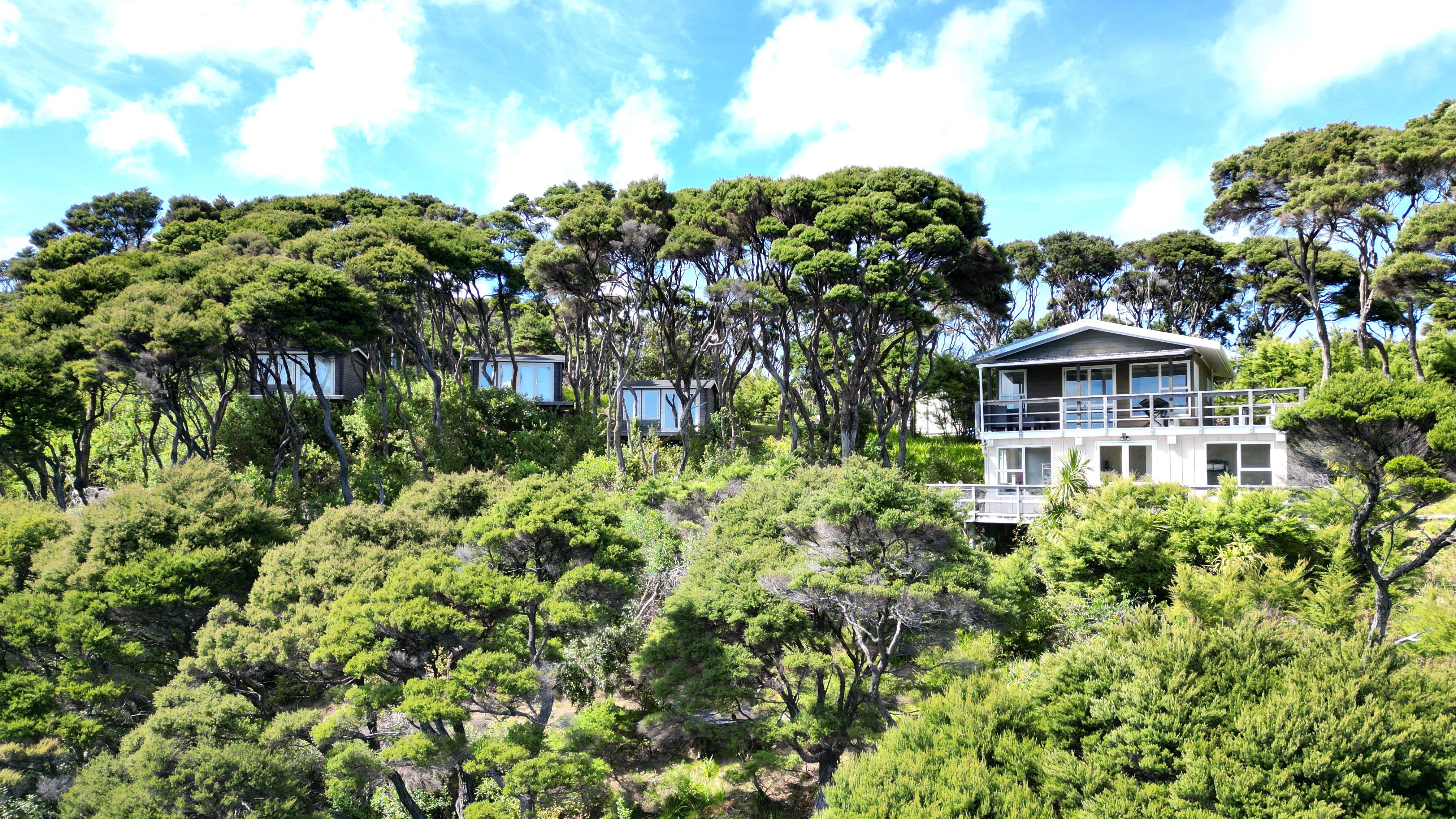 Set on 1.7553 hectares of lush native bush and lawn, the sunny two-level cottage has been designed for relaxed island living, comfortably accommodating families and friends. There’s sleeping for 7-10 inside, with open-plan living areas on both levels that flow out to generous decks – it’s almost impossible to take your eyes off that view!