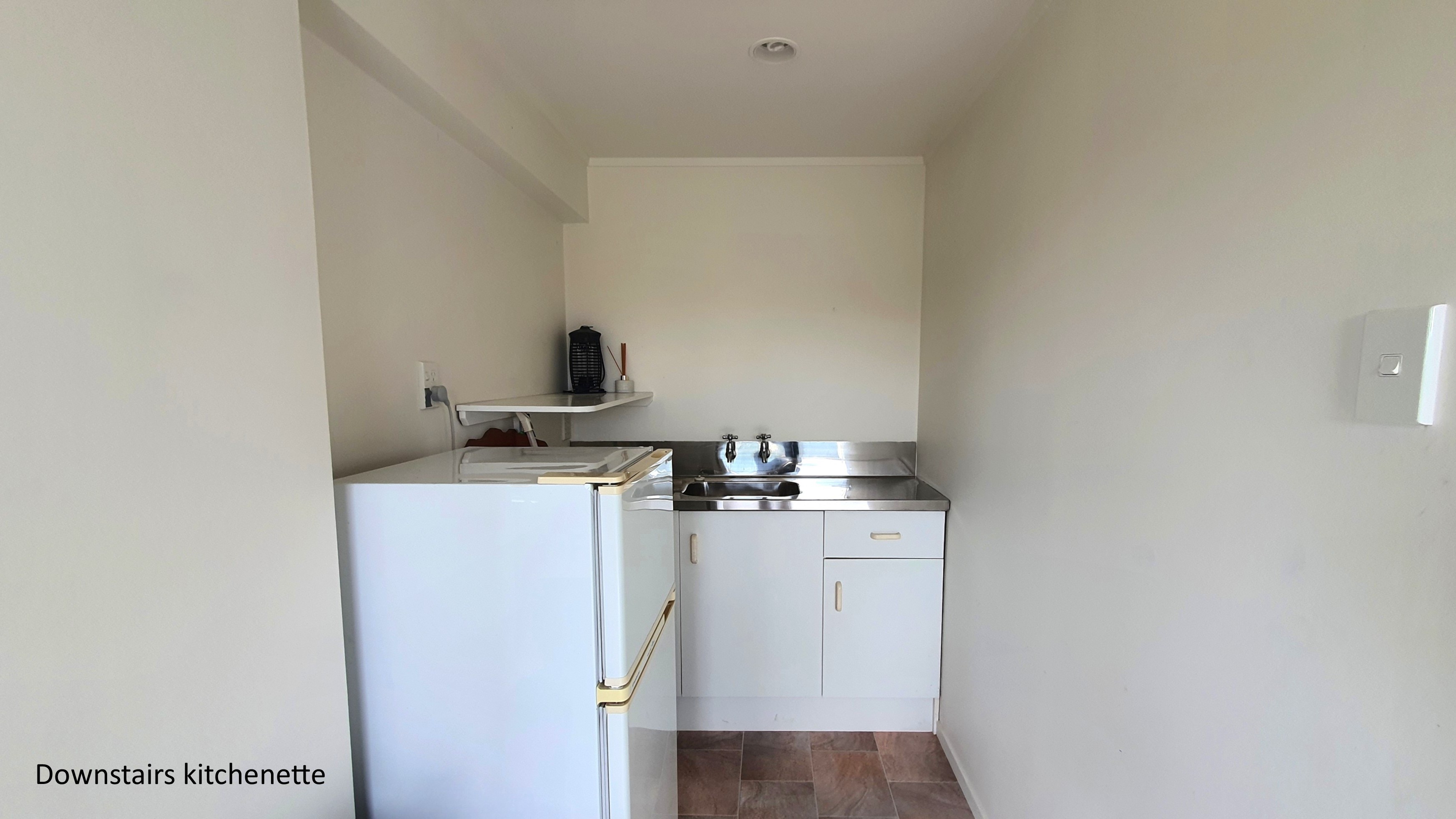 Upstairs you’ll find a good-sized kitchen with pantry, living area, master bedroom, bathroom and laundry. Downstairs offers a handy kitchenette, second toilet and plenty of bunk beds for the crew. Outside, there’s loads of easy-care grounds, a small shed for the toys, and three separate guest cabins that can host another six people.